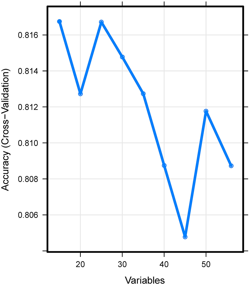 In this study, recursive feature elimination (RFE) as a feature selection method was used to select the most relevant features. In short, RFE recursively fits a model based on smaller feature sets until a specified termination criterion is reached. In each loop, in the trained model, features were ranked based on their importance. Finally, dependency and collinearity were eliminated. Features were then considered in groups of 15/25/35/45/ALL (ALL = 53 variables, as represented in Figure 1) organized by the ranks obtained after the feature selection method. To find the optimal hyperparameters, 10-fold cross-validation was used as a resampling method. In each iteration, every nine folds were used as training subset, and the remaining one fold was processed to tune the hyperparameters. This training-testing process was repeated thirty times. And in this way, each sample would be involved in the training model, and also participated in the testing model, so that all data were used to the greatest extent.