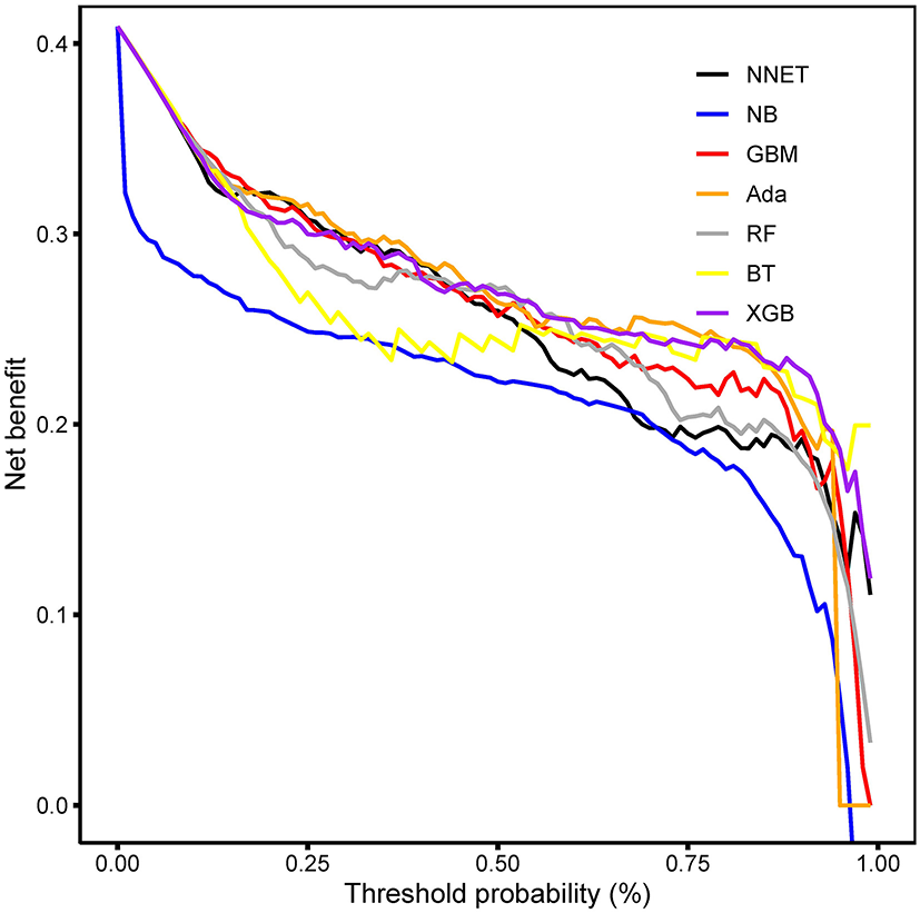 In this study, we employed seven diverse ML algorithms to develop models, containing artificial neural network (NNET), naïve bayes (NB), gradient boosting machine (GBM), adapting boosting (Ada), random forest (RF), bagged trees (BT), and eXtreme Gradient Boosting (XGB). Initially, we conducted internal validation on the development sets to quantify optimism in the predictive performance and evaluate stability of the prediction model. Bootstrap Resampling technique with 100 iterations was used to evaluate the internal validity of each model. External validation of the models was performed in eICU-CRD. All the models were assessed in multiple dimensions regarding their model performance. The median and 95% confidence intervals of area under the curve (AUC) were calculated, where an AUC value of 1.0 means perfect discrimination and 0.5 represents no discrimination. And the accuracy, sensitivity, specificity, negative predictive value, and positive predictive value were also calculated. Additionally, to determine the clinical usefulness of the included variables by quantifying the net benefit at different threshold probabilities, we conducted the decision curve analysis (DCA) (19). Finally, the “Shiny” package in the R was used to construct a visual data analysis platform.