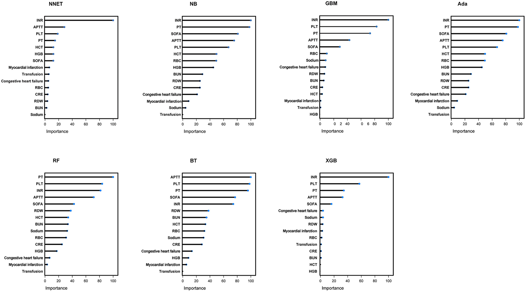 Results: Of 999 patients in MIMIC-IV included in the final cohort, a total of 493 (49.35%) patients developed coagulopathy following TBI. Recursive feature elimination (RFE) selected 15 variables, including international normalized ratio (INR), prothrombin time (PT), sepsis related organ failure assessment (SOFA), activated partial thromboplastin time (APTT), platelet (PLT), hematocrit (HCT), red blood cell (RBC), hemoglobin (HGB), blood urea nitrogen (BUN), red blood cell volume distribution width (RDW), creatinine (CRE), congestive heart failure, myocardial infarction, sodium, and blood transfusion. The external validation in eICU-CRD demonstrated that adapting boosting (Ada) model had the highest AUC of 0.924 (95% CI: 0.902–0.943). Furthermore, in the DCA curve, the Ada model and the extreme Gradient Boosting (XGB) model had relatively higher net benefits (ie, the correct classification of coagulopathy considering a trade-off between false- negatives and false-positives)—over other models across a range of threshold probability values.