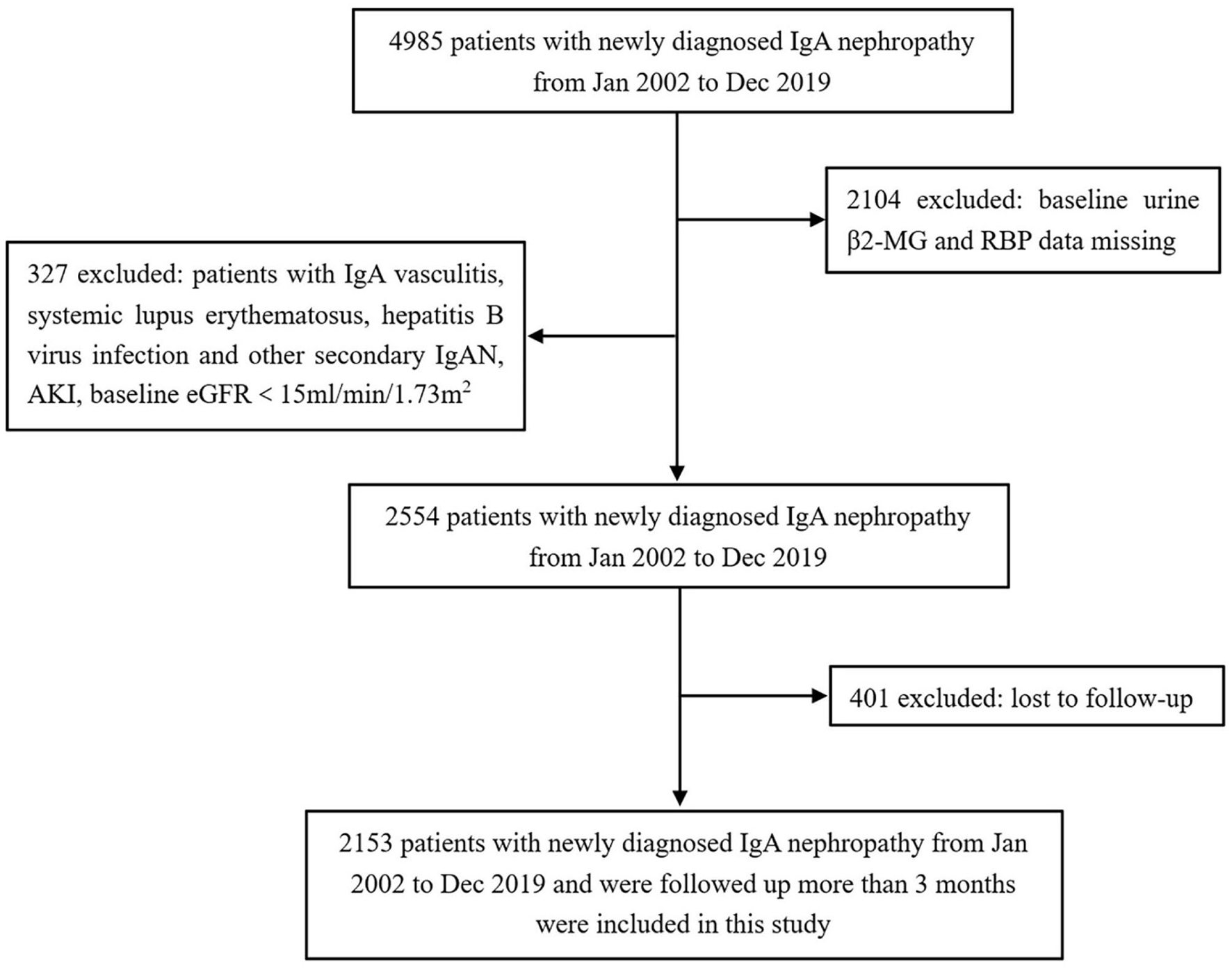 Flowchart of participants in the cohort. β2-MG, β2-microglobulin; RBP, retinol-binding protein; IgAN, IgA nephropathy; AKI, acute kidney injury; eGFR, estimated glomerular filtration rate.