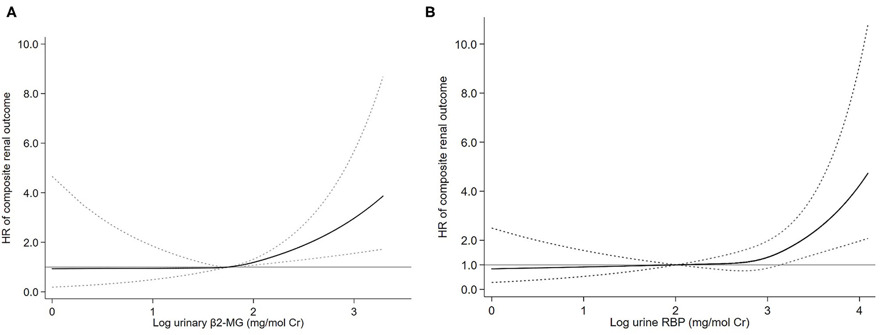 Association of log-transformed urinary β2-microglobulin (β2-MG) (A) and log-transformed urinary retinol-binding protein (RBP) (B) levels with the composite renal outcome. Three knots at the 25th, 50th, and 75th percentiles were used to model restricted cubic splines. Solid lines are multivariable adjusted hazard ratios, with dashed lines showing 95% CIs for the spline model (reference: log β2-MG 1.75 mg/mol Cr and log RBP 2.00 mg/mol Cr). Models were adjusted for age, sex, mean arterial pressure (MAP), log-transformed proteinuria, serum creatinine, and the Oxford classification (MEST-C scores).