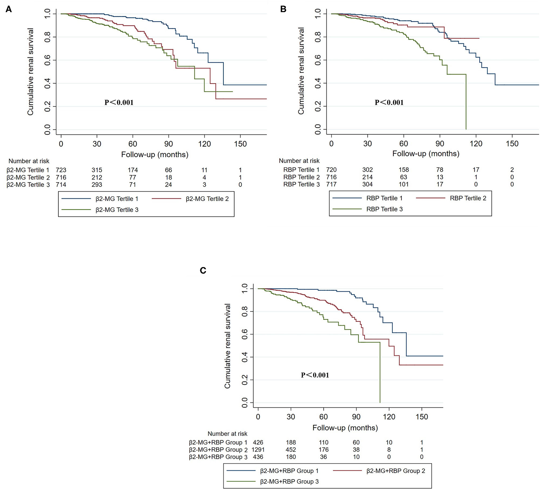 The Kaplan–Meier curves of cumulative renal survival stratified by urinary β2-MG (A), urinary RBP (B), tertiles and the combination of β2-MG and RBP (C). (A) Tertile 1: the first tertile, urinary β2-MG was 20.0 mg/mol Cr [interquartile range (IQR), 10.0–30.0]; tertile 2: the second tertile, urinary β2-MG was 56.0 mg/mol Cr (IQR, 45.0–74.0); tertile 3: the third tertile, urinary β2-MG was 220.0 mg/mol Cr (IQR, 128.0–418.0). (B) Tertile 1: the first tertile, urinary RBP was 110.0 mg/mol Cr (IQR, 25.0–270.5); tertile 2: the second tertile, urinary RBP was 783.5 mg/mol Cr (IQR, 607.5–1014.8); tertile 3: the third tertile, urinary RBP was 2799.0 mg/mol Cr (IQR, 1774.5–4766.5). (C) Group 1: patients in both the first β2-MG and the first RBP tertiles; Group 3: patients in both the third β2-MG and the third RBP tertiles; Group 2: the others.