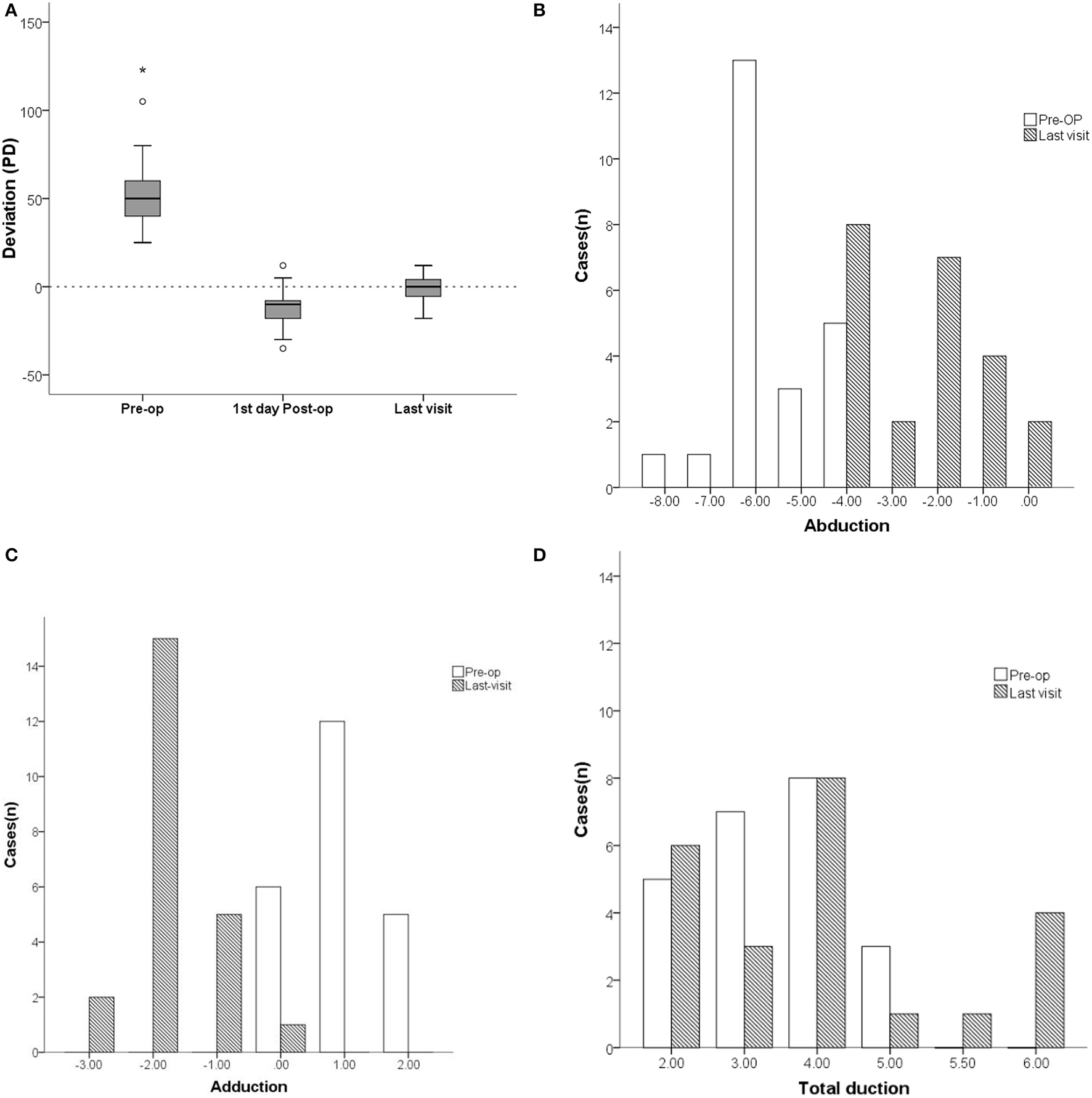 Comparison of deviation (PD) and ocular motility between pre- and postoperation of patients with unilateral complete abducens nerve plasy. (A) The mean pre-operative horizontal esodeviation of 55.5 ± 27.2 PD (range: +25 to +123) significantly improved to −11.5 ± 11.0 PD (range: −35 to +12) on the first day after surgery, and further improved to 0.04 ± 7.3 PD (range: −18 to +12) as determined on their last visit. (B) The mean abduction function increased form −5.6 ± 1.0 (range: −8 to −4) preoperatively to −2.4 ± 1.4 (range: −4 to 0) on their last visit. (C) The mean adductions of the paretic eye decreased from 0.0 ± 0.0 (range: 0 to +2) pre-operatively to a mean deficiency of −1.8 ± 0.7 (range: −3 to 0) on their last visit. (D) The mean duction ranges in the paretic eye increased from 2.4 ± 1.0 pre-operatively to 3.8 ± 1.4 on their last visit. In the box plot (A), the value that is more than 1.5 times the distance from the quartile value is the outlier and is represented by “o”, while the value that is more than 2 times is the extreme value and is marked by “*”. Pre-op, pre-operatively.