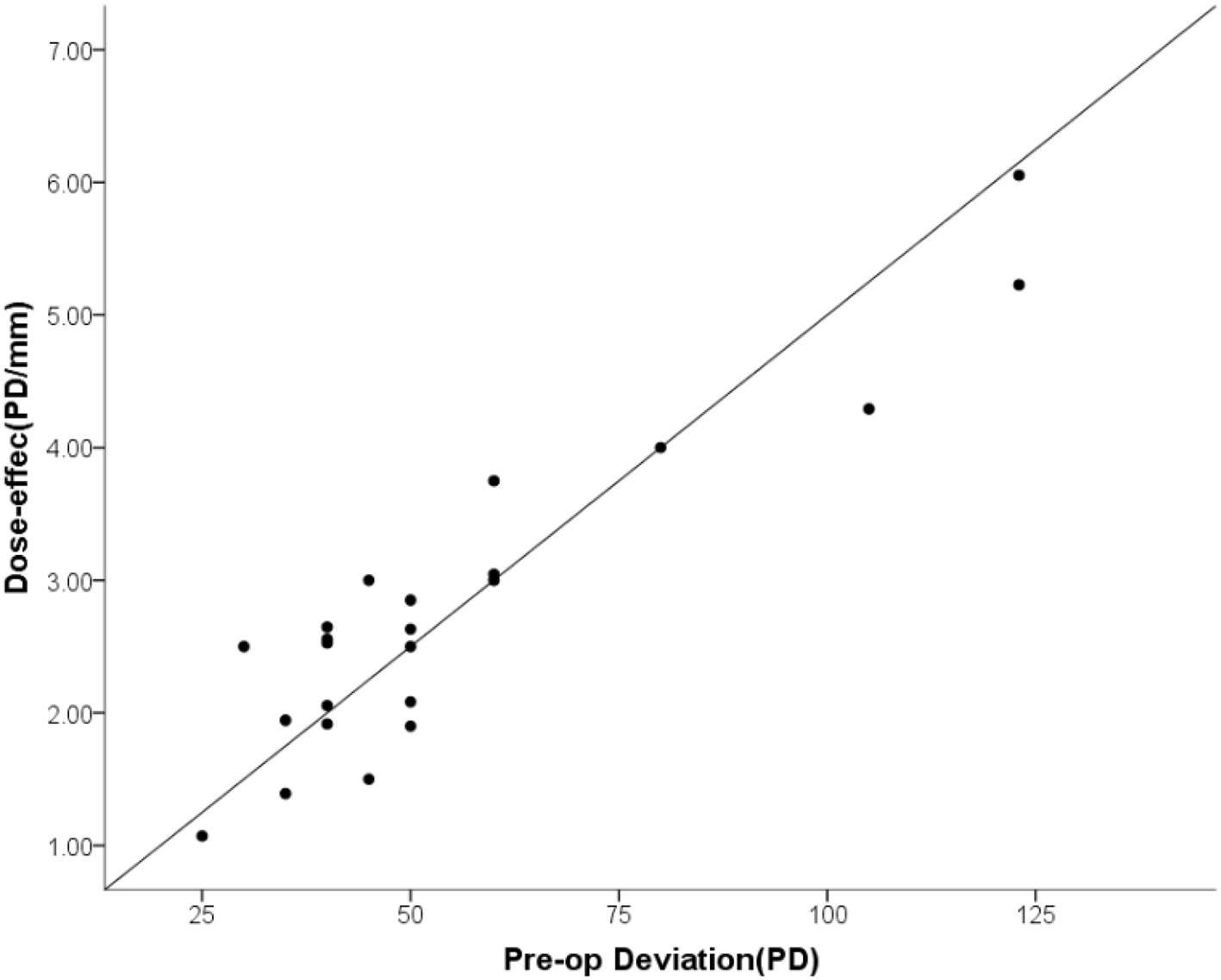 Of these 36 cases, 23 (63.8%) were followed up for greater than 2 months (Mean ± SD = 8.4 ± 6.0, range: 2–24) after surgery and the collected data was presented. Mean ± SD age of these patients was 41.7 ± 14.4 (range: 12–67) years with 73.9% being female. Trauma (52.2%, 12/23) and cerebral lesions (21.7%, 5/23) were the primary etiologies for this condition. Esodeviation in primary position improved from 55.5 ± 27.2 prism diopters (PD) (range: +25 to +123) to 0.04 ± 7.3 PD (range: −18 to +12) as assessed on their last visit. Pre-operative abduction deficits of −5.6 ± 1.0 (range: −8 to −4) reduced to −2.4 ± 1.4 (range: −4 to 0) post-operatively. The mean dose-effect coefficient of 2.80 ± 1.20 PD/mm (range: 1.07–6.05) was positively correlated with pre-operative esodeviation. Rates of overcorrection and ortho were 69.6 and 26.1%, respectively, on the first day after surgery, while on their last visit the respective levels were 4.3 and 82.6%.