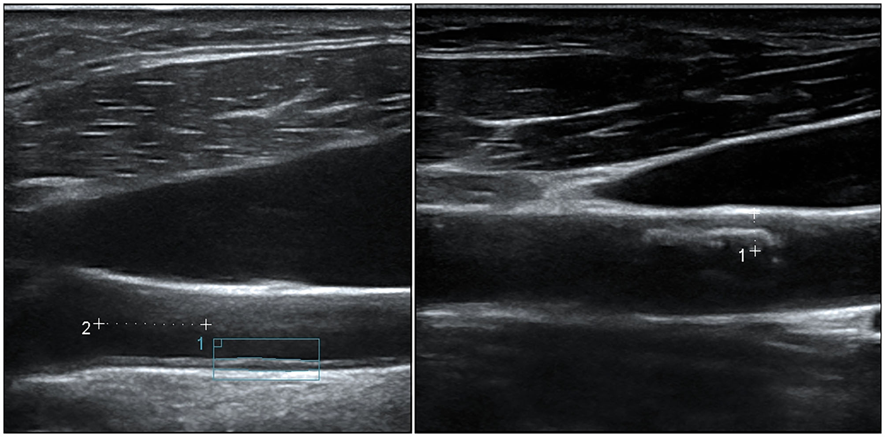 Representative ultrasound features of carotid atherosclerosis. (Left) An increased intima-media thickness (1.048 mm), measured 1 cm proximal to the carotid bulb according to the Mannheim consensus. (Right) A partially calcified atheroma plaque (maximal thickness 3.1 mm) at the anterior wall of the common carotid artery.