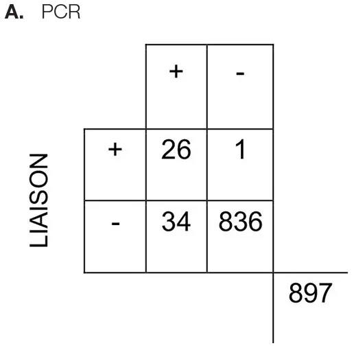 Both assays performed better in symptomatic individuals and samples with low Ct values. The sensitivity of the LIAISON assay increased to 78.8% (95% CI, 61.1–91%) and 88.9% (95% CI, 51.8–99.7) when the analysis was limited to samples with low Ct value and symptomatic patients, respectively. Among the same subgroups, the PPV increased to 96.3% (95% CI, 81–99.9%) and 100% (95% CI, 63.1–100%). Similarly, the sensitivity of the Standard Qassay increased to 54.5% (95% CI, 36.4–71.9%) and 77.8% (95% CI, 40–97.2%) in a sample with low Ct value and symptomatic individuals. The PPV increased to 60% (95% CI, 40.6–77.3) and 87.5% (95% CI, 47.3–99.7%) (Appendix).