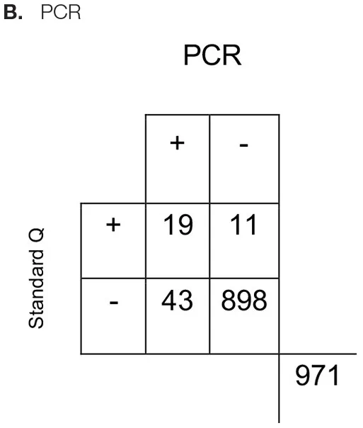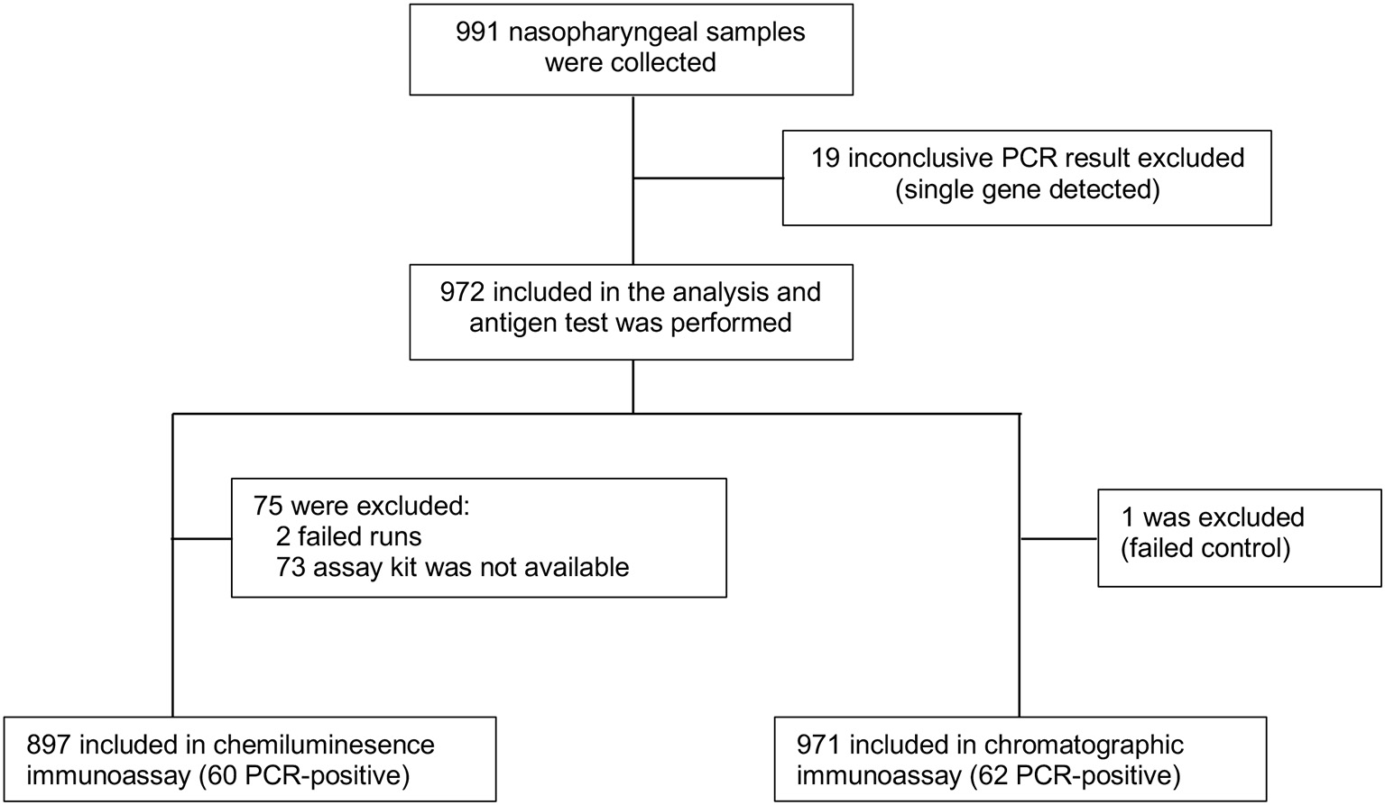 During the study period, 991 individuals agreed to participate in the study. A single PCR target was detected in 19 samples, was confirmed with repeat testing, and was excluded from the analysis (Figure 1). Of those sample, 15 had amplification of the N gene only, three were ORF gene positive, and one sample was S gene positive. In addition, one sample had a failed control and was excluded from Standard QAg test analysis. Also, 75 samples were excluded from the LIAISON SARS-CoV-2 Ag assay performance analysis (two samples failed controls, 73 were not done due to shortage of testing kits).