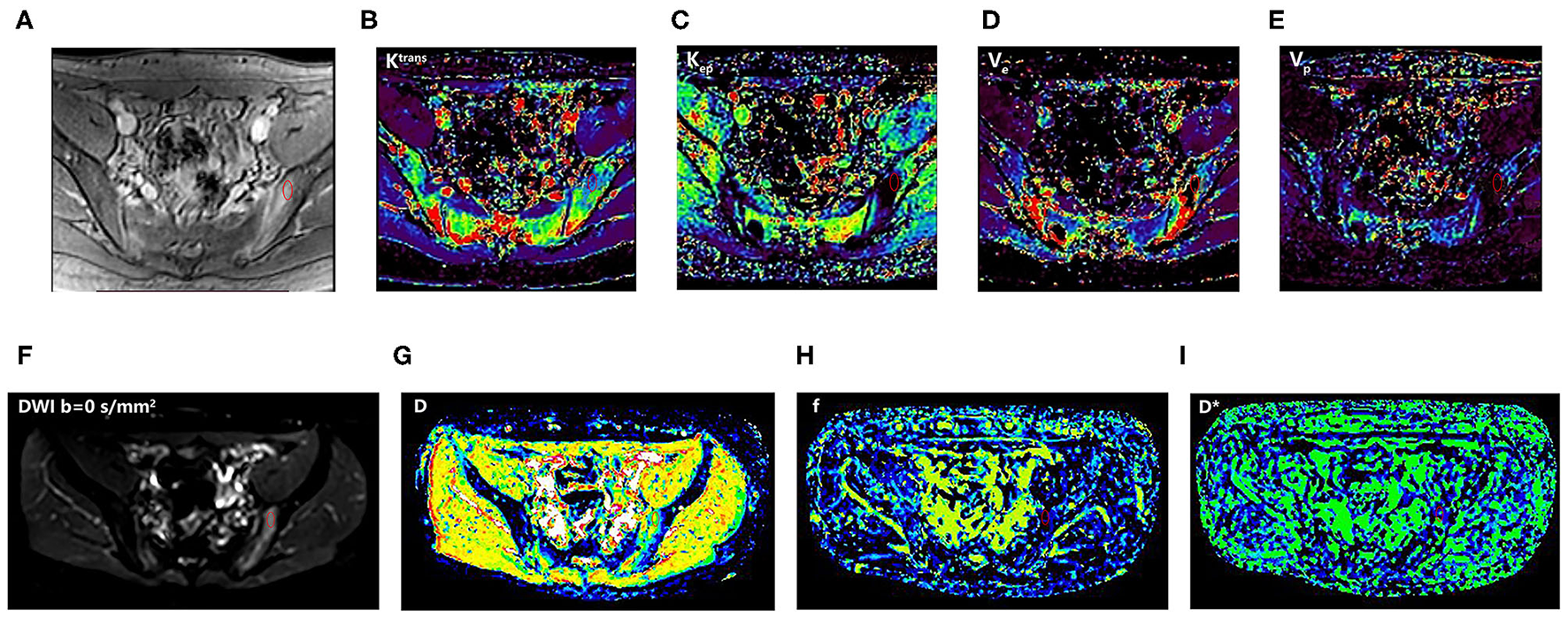 An 18-year-old man with SpA. The first-row images (A–E): DCE-MRI and corresponding quantitative parameter images (Ktrans, Kep, Ve, and Vp) showing the position of ROI; the second-row images (F–I): corresponding DWI (b = 0 s/mm2) and IVIM-DWI parameter images (D, f, and D*). SpA, spondyloarthritis; ROI, region of interest; T2W_SPAIR, T2-weighted spectral attenuated inversion recovery; DWI, Diffusion-weighted imaging; IVIM, intravoxel incoherent motion; D, pure diffusion coefficient; f, perfusion fraction; D*, pseudo-perfusion coefficient; DCE-MRI, dynamic contrast-enhanced magnetic resonance imaging; Ktrans, endothelial transfer constant; Kep, reflux rate; Ve, fractional extravascular extracellular space volume; and Vp, fractional plasma volume.