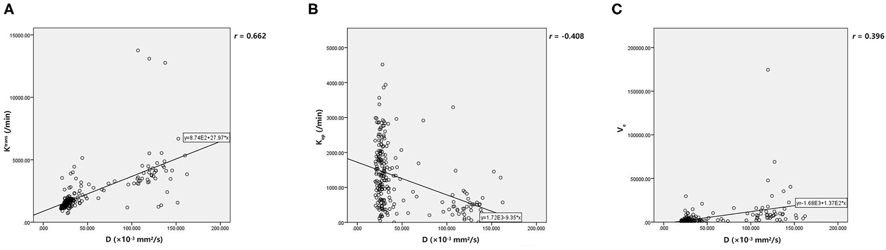 The study eventually enrolled 234 patients (178 men, 56 women; mean age, 28.51 ± 9.50 years) with axSpA. With controlling confounders, D was independently related to Ktrans (regression coefficient [b] = 27.593, p < 0.001), Kep (b = −6.707, p = 0.021), and Ve (b = 131.074, p = 0.003), whereas f and D* had no independent correlation with the parameters from DCE MRI. The correlations above were exhibited with Pearson's correlation coefficients (r) (r = 0.662, −0.408, and 0.396, respectively, all p < 0.001).