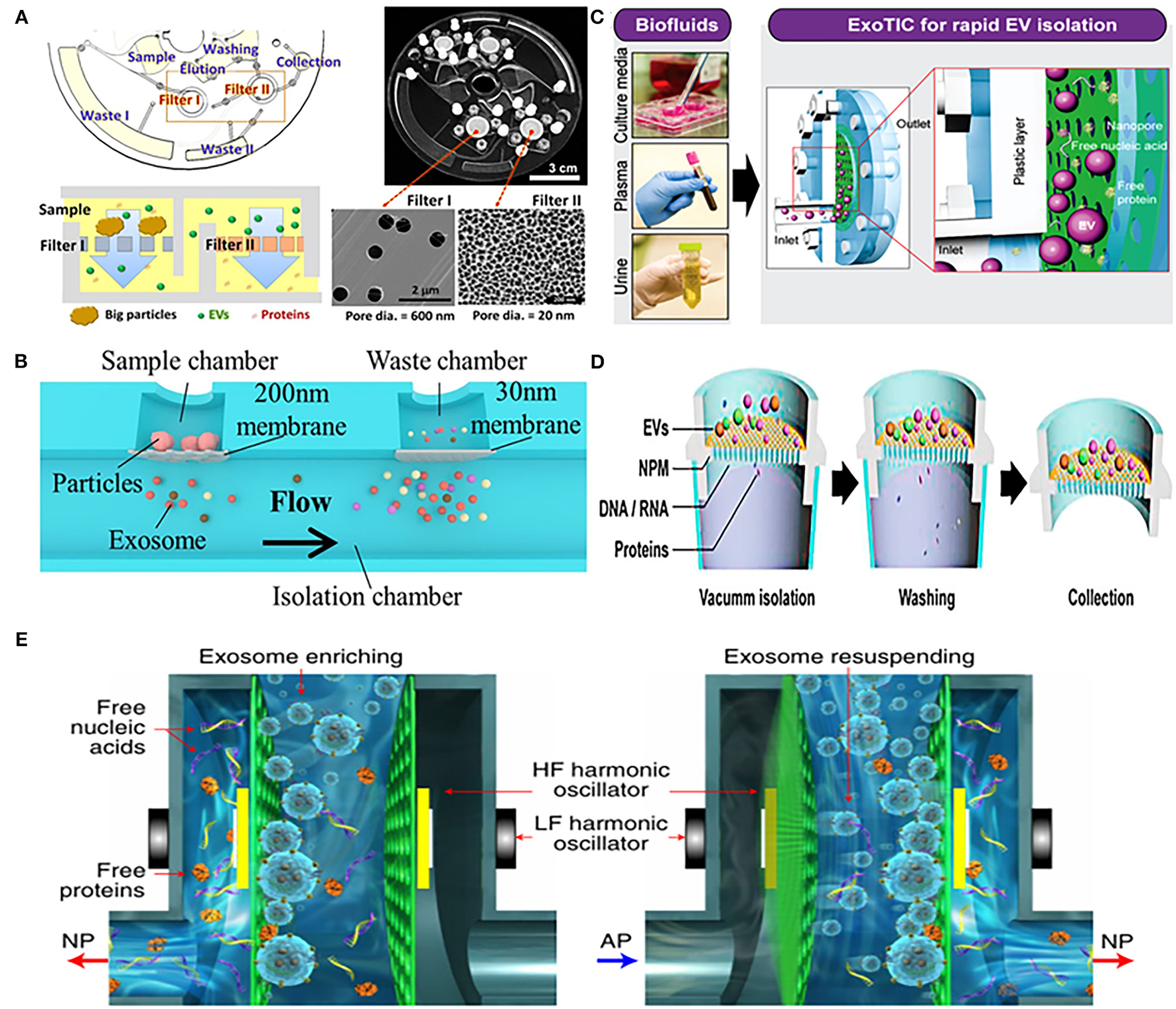 Woo et al. designed an integrated centrifugal microfluidic platform, simplifying the isolation steps of EVs from urine (Figure 1A). The main functional components of the platform were two nanomembrane filters used in centrifuge with low g-forces (<500 g), and their pore diameter ratio was 600:20 nm (Filter I: Filter II). Nanofilter I was used to intercept large particles, and then filter out free nucleic acids and proteins through nanofilter II, so that target-sized EVs were enriched on the nanofilter II. The platform completed the entire extraction process within just 30 min with a high recovery of over 95%. In addition, the concentration of mRNA captured by the device was 100 times higher than that of UC, providing a rich material basis for subsequent downstream analysis (65). Double nanomembranes were also used to filter urinary EVs in Liang's research, with the pore size of nanofilms as 300:20 nm. In this platform, two nanomembranes with different pore sizes were used to remove large particles of impurities and soluble proteins, in order to achieve the purpose of purifying EVs from urine (71) (Figure 1B).