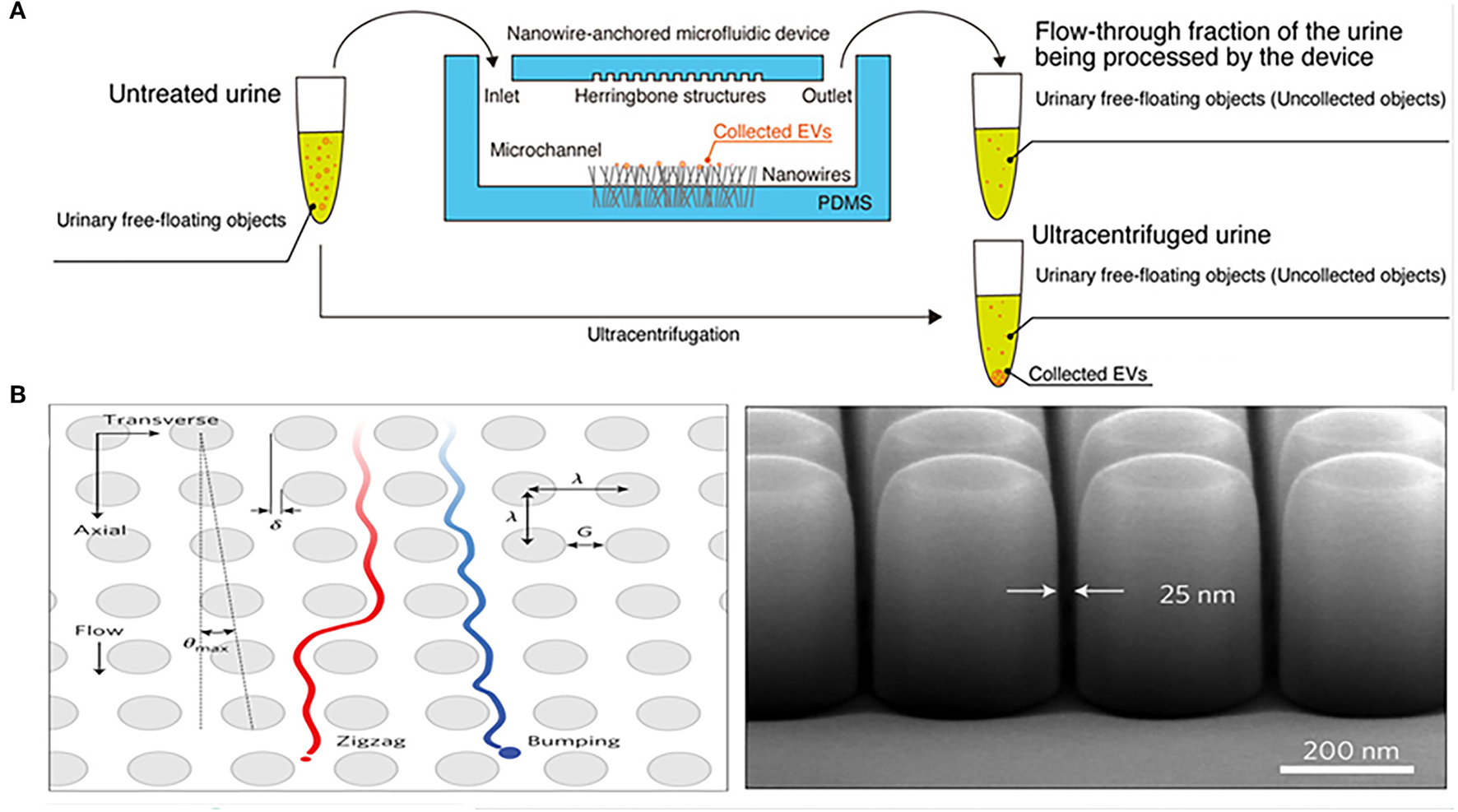 Microfluidic chips based on nanomaterials for isolation of EVs from urine. (A) Mechanism of a microfluidic chip for isolating urinary EVs using electrostatic interactions between the anchored ZnO/Al2O3 core-shell nanowires and EVs. Reprinted with permission from Yasui et al. (70). (B) Mechanism of a microfluidic chip composed of arrays of the deterministic lateral displacement (DLD) pillars for urinary exosomes isolation. Reprinted with permission from Wunsch et al. (72).