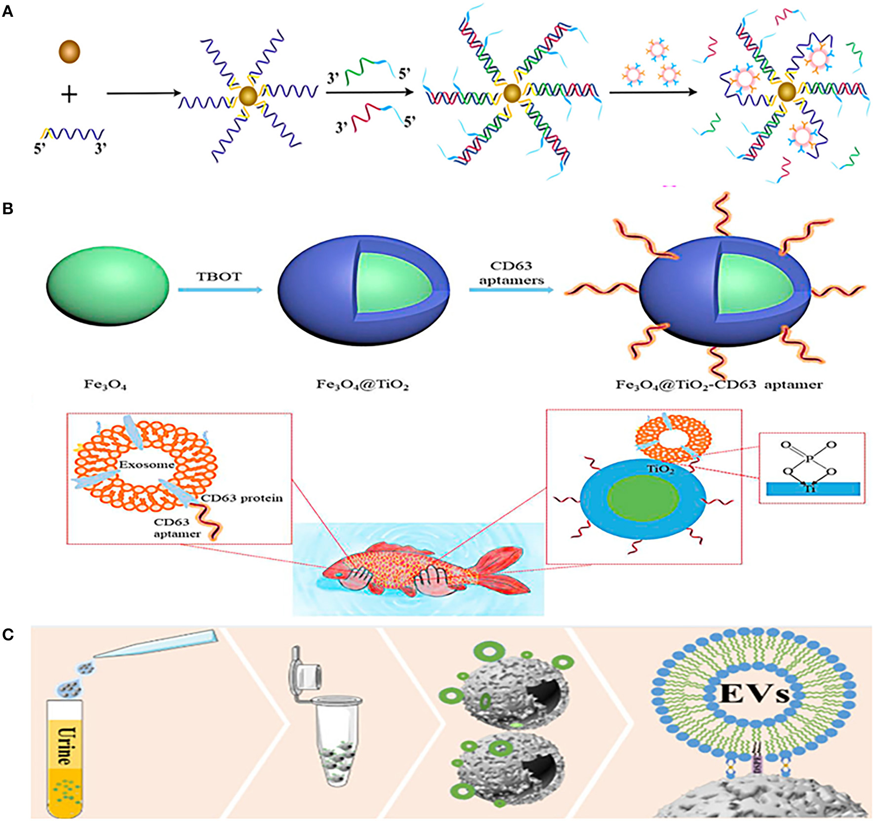 Although the combination of magnetic nanobeads and antibodies is widely used in EVs separation, aptamers are also commonly used to combine with magnetic nanobeads. Li et al. combined prostate-specific membrane antigen (PSMA) aptamers with superparamagnetic Fe3O4 nanoparticles, and then modified them with single-stranded DNA to form a superparamagnetic conjunctions complex (Figure 3A). The complex could identify PCa-related exosomes through the specific binding of PSMA aptamers and PSMA-positive exosomes in urine, and then the exosomes would be easily isolated through the restriction sites of the aptamers (76). Another similar aptamer complex (Fe3O4@TiO2-CD63 aptamer) composed of CD63 aptamer and Fe3O4 nanoparticles coated by TiO2 (Figure 3B). The aptamer has dual affinity, including the interaction between TiO2 and the phosphate group of exosomes, and the interaction between CD63 aptamer and the surface protein of exosomes. This dual affinity effects enabled the aptamer to capture urinary exosomes powerfully within just 10 min and the recovery rate is as high as 92.6%, just like the authors' analogy, catching fish with two hands is definitely stronger than catching fish with one hand (77).