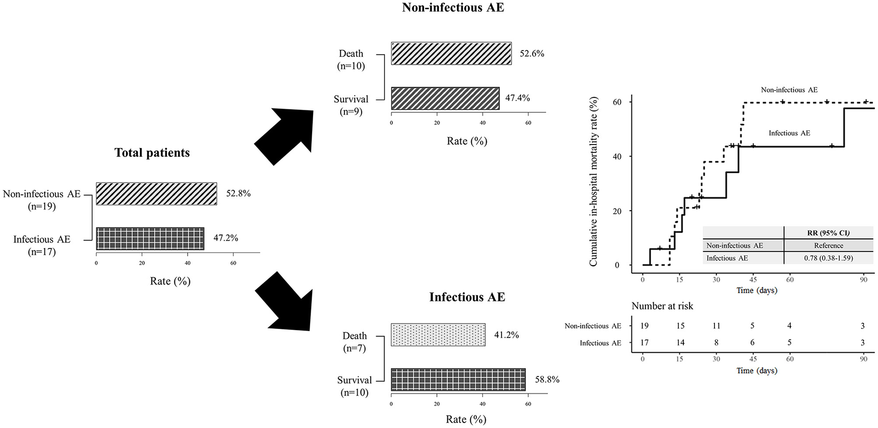 Among the 36 patients, 17 were diagnosed with infectious AE. The overall in-hospital mortality rate of AE was 47.2%. Although the mortality rate in patients with infectious AE was lower (41.2%) than in those with non-infectious AE (52.6%), this difference was not statistically significant (p = 0.724). A survival analysis showed no significant difference in mortality between patients with infectious AE versus those with non-infectious AE [risk ratio = 0.78, 95% CI = 0.38–1.59].