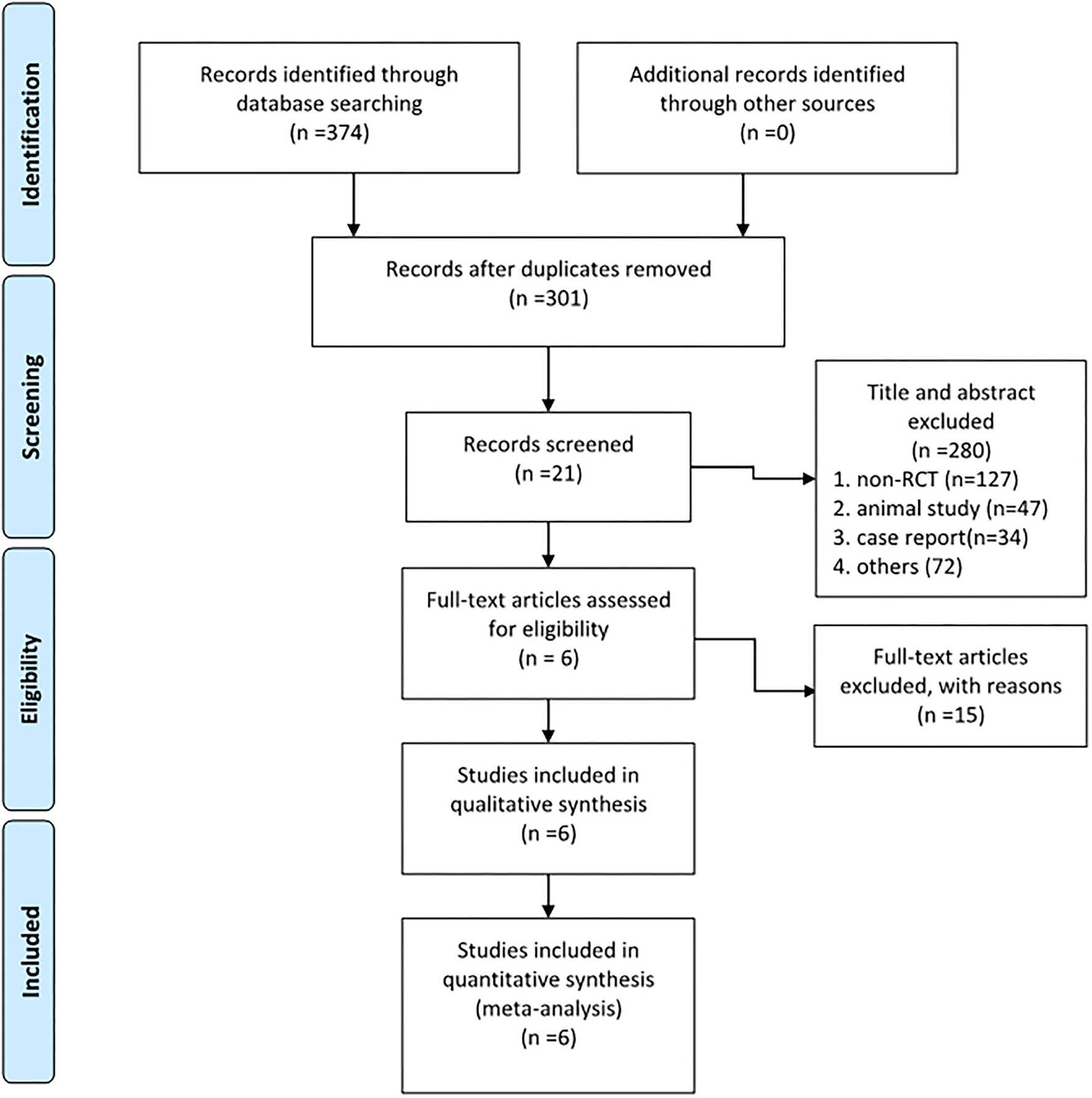 As shown in Figure 1, among 374 articles that were obtained from the databases via the search strategy, 301 articles were screened after removing duplicates. In total, 280 articles were removed after reading the title and abstract based on the inclusion and exclusion criteria. Then, 15 studies were excluded after reading the full text for the irrelevant content or low quality. Finally, 6 RCTs (18–23) were included in this study.