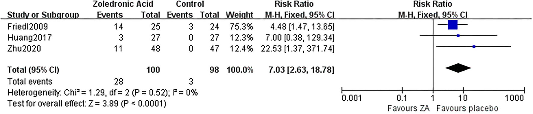 Results: In this study, six RCTs involving a total of 307 patients were finally included and analyzed. The pooled data demonstrated that significantly less periprosthetic BMD loss in Gruen zone seven had occurred in the ZA-treated patients than in the control patients at 3 months (mean difference [MD] = 4.03%; 95% CI: 0.29–7.76%; P = 0.03), 6 months (MD = 7.04%; 95% CI: 2.12–11.96%; P = 0.005), and 12 months (MD = 7.12%; 95% CI: 0.33–13.92%; P = 0.04). The Harris Hip Score (HHS) was also significantly increased in ZA group at 6 and 12 months after operation (P = 0.03 and P = 0.02, respectively). Influenza-like symptom was found related to the usage of ZA [relative risk (RR) = 7.03, P < 0.0001].
