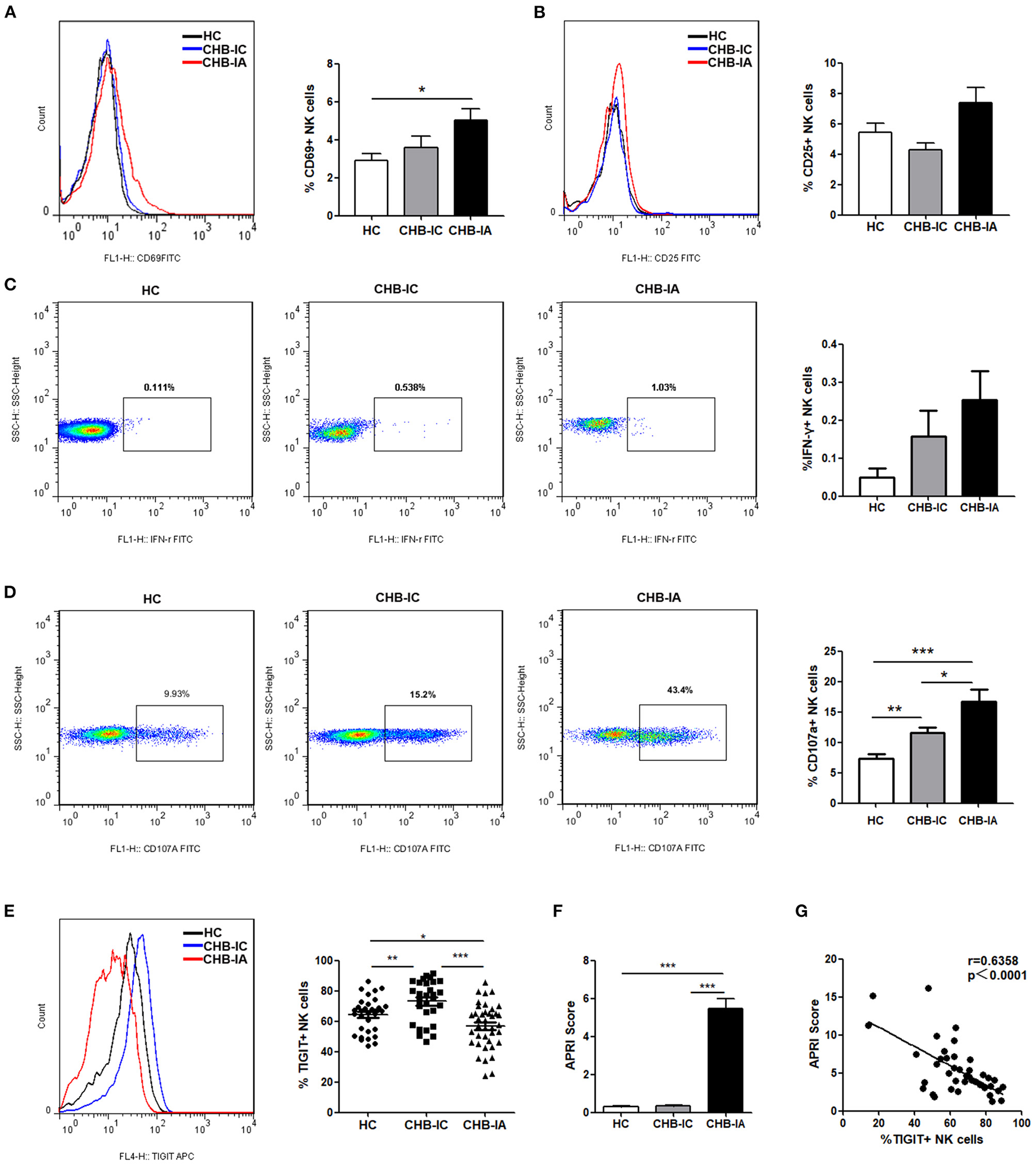 NK cells phenotype and TIGIT levels in the three groups of patients. (A–C) PBMCs isolated from CHB-IA, CHB-IC, and healthy individuals were analyzed by flow cytometry without any stimulate. Representative FACS histograms showing the expression of CD69 (A) or CD25 (B) on peripheral blood NK cells. The mean fluorescence intensity (MFI) of CD69 (A) or CD25 (B) is shown as mean ± SEM (n = 7~12). (C) Representative FACS plots showing the production of IFN-γ in peripheral blood NK cells without stimulation. The percentages of IFN-γ is also shown as mean ± SEM (n = 10 subjects per group, right). (D) The PBMCs isolated from the three groups were stimulated with IL-12 for 24 h with K562 as target cells. Representative FACS plots showing the expression of CD107a on peripheral. The percentages of CD107a + NK cells are shown as mean ± SEM (n = 16–23 subjects per group) (Mann-Whitney U test). (E) Representative FACS histograms showing the expression of TIGIT on peripheral blood NK cells. The mean fluorescence intensity (MFI) of TIGIT is also shown as mean ± SEM (n = 10 subjects per group, right). (F) APRI score in the three groups is shown as the mean ± SEM (n = 9 subjects per group). Data are from a single experiment representative of three. ***p 0.001 (Student's t-test). (G) Correlation between TIGIT and APRI scores expression on NK cells in CHB patients is shown (Spearman's rank correlation test). Each symbol represents an individual donor. Data are from a single experiment representative of three. *p < 0.05, **p < 0.01, ***p < 0.001.