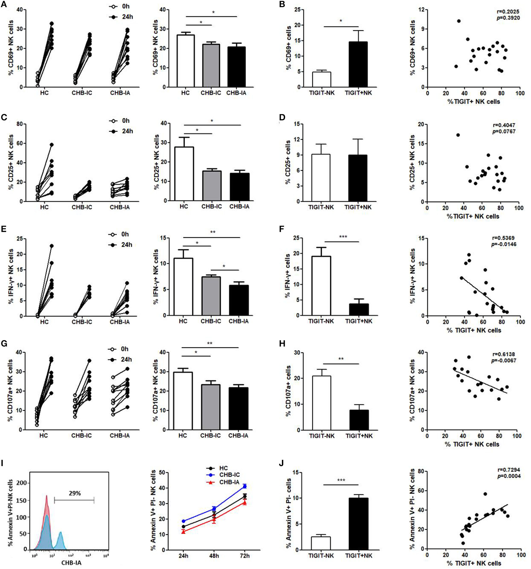 Correlations of TIGIT expression with the function of NK in different groups of the study. PBMCs isolated from CHB-IA, CHB-IC and healthy individuals were stimulated with LPS (A–D) or IL-12 (E, F) for 24 h. (A,C) The percentages of CD69+ (A) or CD25+ (C) NK cells before and after stimulation with LPS in the three groups were evaluated by flow cytometry. Data are expressed as the mean ± SEM (n = 8–15 subjects per group) and are from a single experiment representative of three. *p < 0.05 (Mann-Whitney U test). (B,D) The percentages of LPS-stimulated CD69 (B) or CD25 (D) on TIGIT- or TIGIT+ NK cells was measured by flow cytometry. Correlation between TIGIT expression and percentages of LPS-stimulated CD69 (B) or CD25 (D) on NK cells is also shown (Spearman's rank). (E) The percentages of IFN-γ in NK cells before and after stimulation with IL-12 in the three groups were evaluated by flow cytometry. Data are expressed as the mean ± SEM (n = 10). (F) The percentages of IL-12-stimulated IFN-γ in TIGIT- or TIGIT+ NK cells was measured by flow cytometry. Data are shown as the mean ± SEM (n = 10). Correlation between TIGIT expression and percentages of IL-12-stimulated IFN-γ in NK cells is also shown (Spearman's rank). (G,H) PBMCs were stimulated with IL-12 in the presence of K562 cells for 24 h. (G) The percentages of CD107a+ NK cells before and after stimulation with IL-12 in the three groups were evaluated by flow cytometry. Data are expressed as the mean ± SEM (n = 8–10 subjects per group). (H) The percentages of CD107a on TIGIT- or TIGIT+ NK cells was measured by flow cytometry. Correlation between TIGIT and LPS-stimulated CD107a expression on NK cells (Spearman's rank correlation test). (I,J) PBMCs isolated from CHB-IA,CHB-IC and healthy individuals were stimulated with LPS for 24 h, 48h and 72h. (I) FACS histograms showing the apoptosis of NK cells from a CHB-IA patient. The apoptosis of (Annexin V+PI-) NK cellsin CHB-IA groups was analyzed at different time points and shown as the mean ± SD (n =5 subjects per group). (J) The percentages of Annexin V+PI- on TIGIT- or TIGIT+ NK cells was measured by flow cytometry. Data are shown as the mean ± SEM (n = 5 subjects per group). Data are from a single experiment representative of three. *p < 0.05, **p < 0.01, ***p < 0.001.