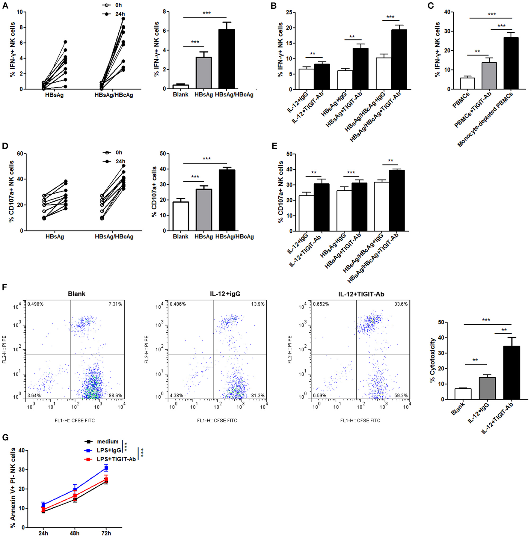 Blockade of the TIGIT pathway affects NK-cell function in CHB-IA. (A,B,D–F) PBMCs isolated from CHB-IA were stimulated with IL-12 or specific stimulants (recombinant HBsAg protein or recombinant HBsAg and HBcAg protein mixture) in the (A,D) absence or (B,E) presence of TIGIT-Ab protein or IgG control for 24 h. The percentages of (A,B) IFN-γ and (D,E) CD107a in NK cells before and after stimulation were evaluated by flow cytometry (n = 10). (C) PBMCs or monocyte-depleted PBMCs were stimulated with IL-12 for 24 h. Representative FACS dot plots showing IFN-γ expression in NK cells from PBMCs or monocyte-depleted PBMCs (n = 10). (F) Purified NK cells stimulated with or without IL-12 in the absence or presence of TIGIT-Ab for 24 h were collected as effector cells. K562 cells labeled with CFSE were used as target cells. E:T ratios was 1:10 for 6 h. Representative FACS plots showing cytotoxicity of NK cells. The cytotoxicity of NK cells in CHB-IA was analyzed and shown as the mean ± SD (n = 5 subjects per group). (G) PBMCs isolated from CHB-IA were stimulated with LPS in the absence or presence of TIGIT-Ab for 24, 48, and 72h. The percentages of Annexin V+PI- NK cells was measured by flow cytometry. Data are shown as the mean ± SEM (n = 5). Data are from a single experiment representative of three. *p < 0.05, **p < 0.01, ***p < 0.001.