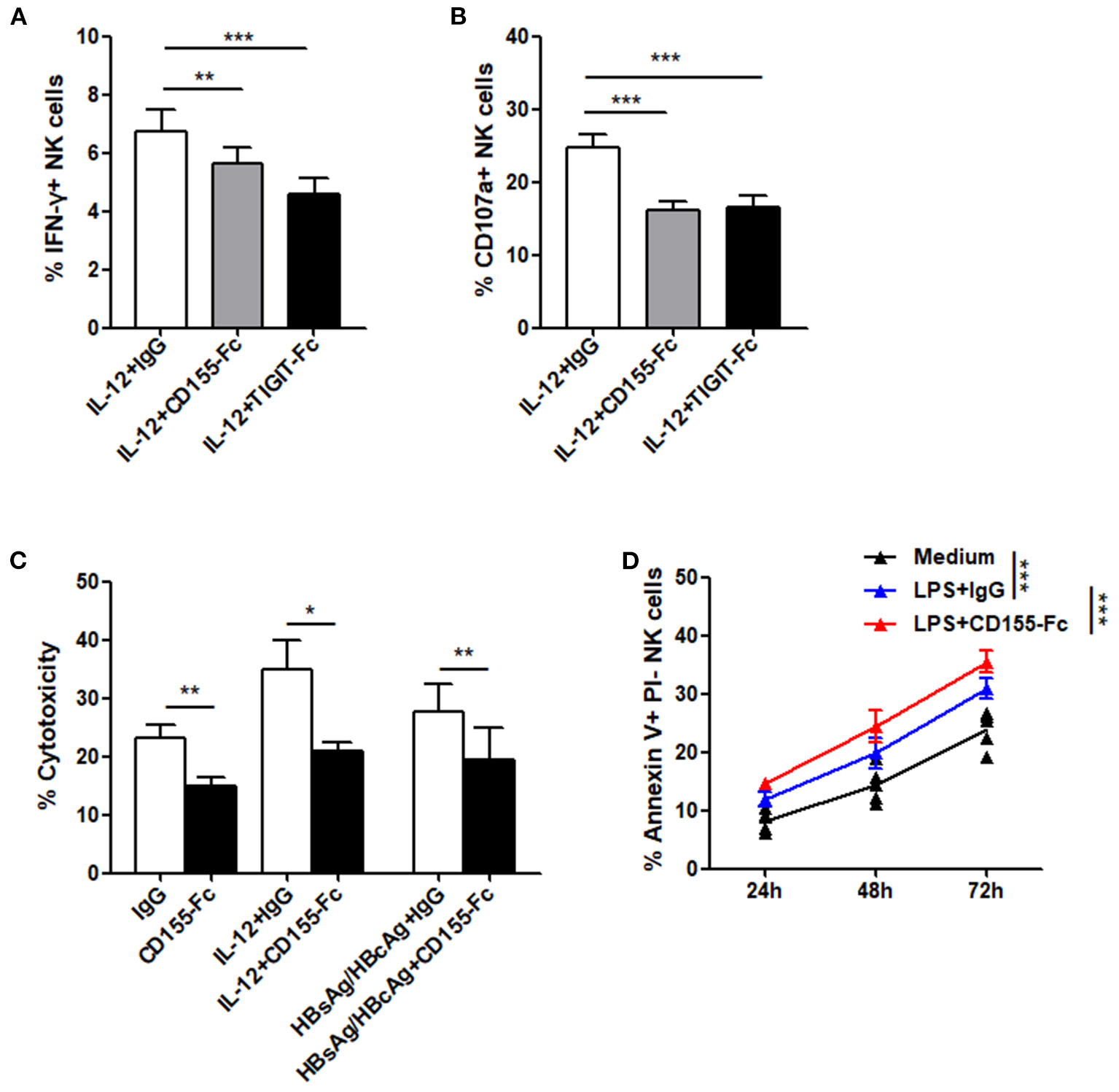 (A–C) PBMCs isolated from CHB-IA were stimulated with IL-12 or specific stimulants (recombinant HBsAg protein or recombinant HBsAg and HBcAg protein mixture) in the (A,D) absence or (B,C) presence of CD155Fc or TIGIT Fc protein or IgG control for 24 h. The percentages of (A) IFN-γ and (B) CD107a in NK cells before and after stimulation were evaluated by flow cytometry. (C) K562 cells labeled with CFSE were used as target cells. E:T ratios was 1:10 for 6 h. Representative FACS plots showing cytotoxicity of NK cells. The cytotoxicity of NK cells inCHB-IA was analyzed and shown as the mean ± SD (n = 5). (D) PBMCs isolated from CHB-IA were stimulated with LPS in the absence or presence of CD155Fc or IgG control or 24, 48, and 72h. The percentages of Annexin V+PI- NK cells was measured by flow cytometry. Data are from a single experiment representative of three. *p < 0.05, **p < 0.01, ***p < 0.001.
