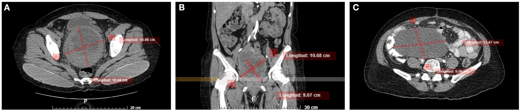 Abdominal axial (A) and coronal (B) non-enhanced CT images show a large well-defined rounded tumor, with a heterogeneous appearance in the cervix and demonstrating mass effect in adjacent structures and preserving interface with the bladder wall and rectum. (C) Axial non-enhanced CT, three months after surgery shows a heterogeneous abdominal tumor that compresses and displaces adjacent structures.