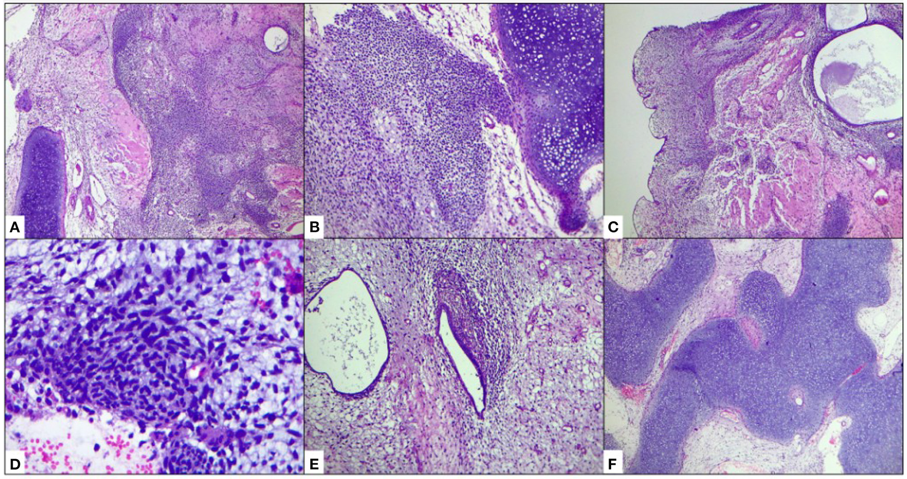 Histology of the tumor. (A,B) A mixed malignant neoplasm made up of cartilaginous areas that alternate with areas of paucicellular spindle malignant cells is observed, within which tubular and ectatic glandular structures can be seen. (C) Formation of “leaf-shaped” structures. (D) Malignant high-grade spindle cell component. (E) Glands with a “benign” endometrial appearance, surrounded by packed malignant stromal cells (cambium layer). (F) Extensive areas with malignant chondroid differentiation.