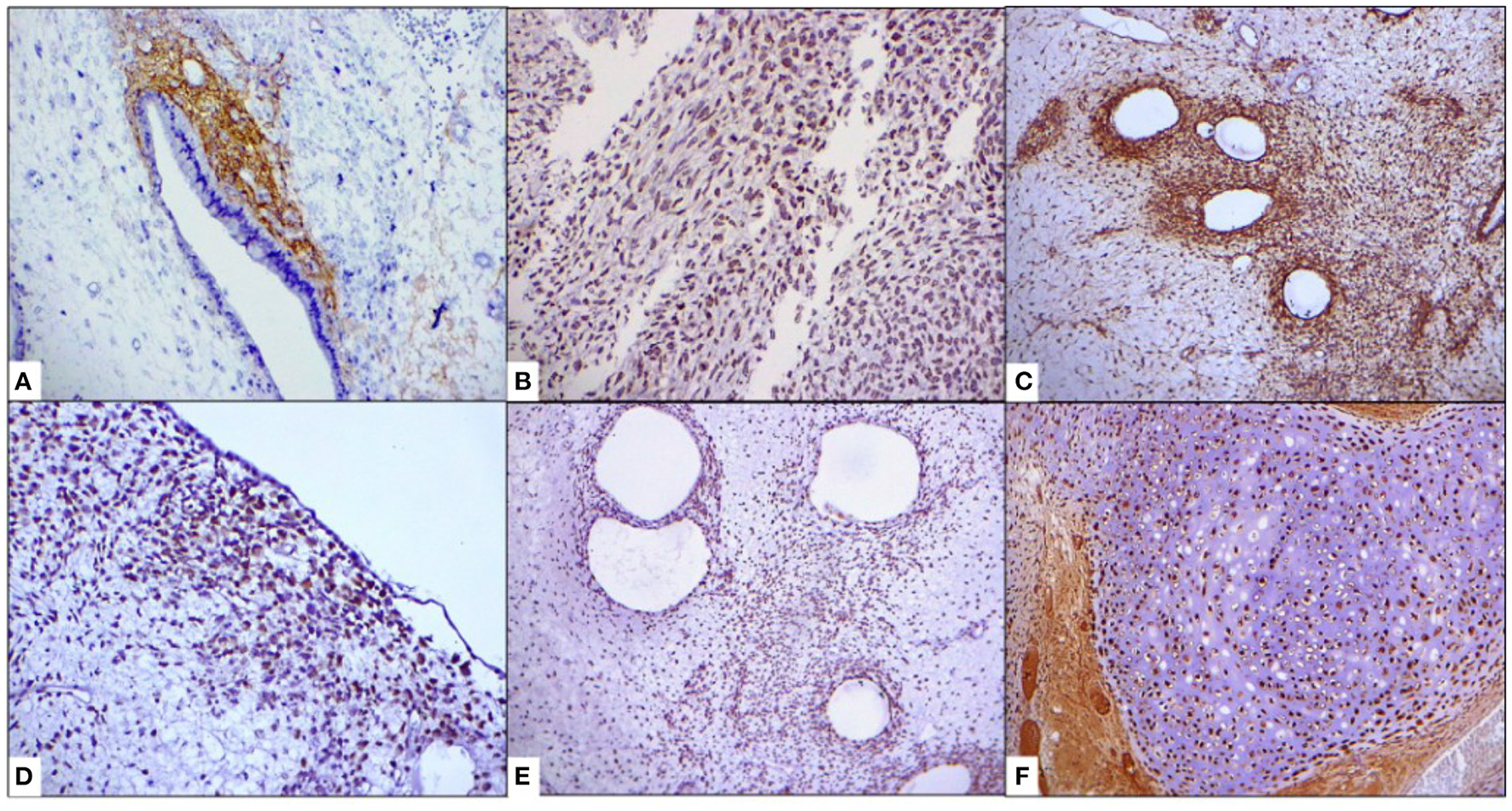Immunohistochemistry. (A) CD10. (B) p53. (C) Beta-catenina. (D) hTERT. (E) PMS2. (F) S-100.