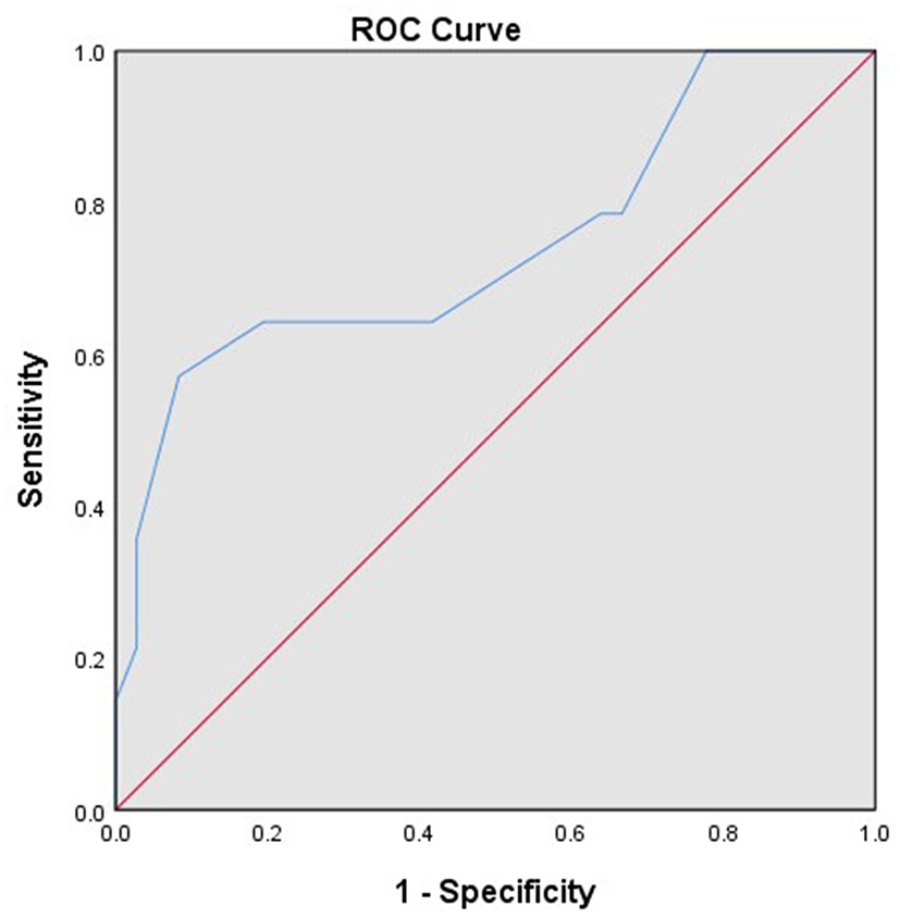 A total of 82 patients with endometrial stromal sarcoma who were treated in our hospital were collected. Four patients without surgery were excluded, and four patients who were unable to perform satisfactory tumor reduction surgery and only took biopsy were excluded. The final analysis includes 74 patients with endometrial stromal sarcoma. Clinicopathological features of these patients are listed in Table 1. Most patients have International Federation of Gynecology and Obstetrics (FIGO) Stage I tumors (46/74, 62.16%). The patients with low-grade endometrial stromal sarcoma account for 67.57% (50/74). The median follow-up time of the patients with endometrial stromal sarcoma was 53 months, ranging from 7 to 132 months. There are 17 patients with recurrent endometrial stromal sarcoma, 11 of them died due to recurrence. According to receiver operating characteristic curve and the Youden index, the optimal cut-off value of the Ki-67 index for predicting recurrent endometrial stromal sarcoma was 35% (Figure 1). The area under the curve was 0.743 [95% CI: 0.574–0.912], and the sensitivity, specificity, and accuracy were 57.1, 91.7, and 74.6%, respectively.