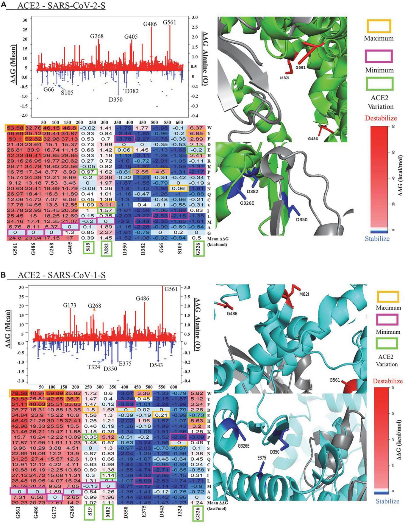 The mean values of ΔΔG at each ACE2 residue position and ΔΔG value of substitutions to alanine are shown in the line charts of Figure 2. In the ACE2-SARS-CoV-2-S complex, the mutations in G561 cause the maximum destabilizing effects (mean ΔΔG = 24.80 kcal/mol), while the mutations in D350 have the highest stabilizing effects (mean ΔΔG = −1.52 kcal/mol). A similar pattern of mean ΔΔG was observed in the ACE2 - SARS-CoV-1-S complex, with a range from 29.23 kcal/mol in G561 to -1.58 kcal/mol in D350. The heatmaps of top residues with the maximum destabilizing/stabilization effects of mutations on ACE2 stability and the structural representations of these key residues are shown in Figure 2. Here, we probed for the most destabilizing residues that were common to both complexes. As shown in Figure 2 and Table 1, the mutations at Glycine (G) residue positions G561, G486, G268, G405, and G399 have the maximum destabilizing effects on ACE2 in both complexes. Glycine is the simplest and non-essential amino acid because it has only a hydrogen atom as its side chain. Mutation of G to other larger amino acids will result in adverse conformation variations and destabilize the protein complex, which makes it responsible for over 15% of genetic diseases (36). Its size is often critical in allowing polypeptide chains to make tight turns or to approach one another closely. Residues that replace glycine disturb the helix fold, subjecting chains to additional hydroxylation and glycosylation. Hence, since glycine is crucial in helix formation, substitution at numerous nucleotide sites will result in a clinically evident phenotype (37). Consequently, glycine to glutamic acid substitution can reduce the activity of ACE2 in the central nervous system, thereby affecting the signal transduction between ACE2 in pleural cavities. Interestingly, when G is mutated to tryptophan (W), it causes the highest destabilization energy. A G to W substitution can interact with other aromatic or positively charged residues. W is the largest amino acid and is found to have the highest probability of causing disease [Klein (38)]. In both complexes, the greatest energy instability was seen when G was mutated to W at positions 561, 405, and 399. The greatest unstable energy value was also seen in G561W in both ACE2 - SARS-CoV-1-S/ACE2 - SARS-CoV-2-S (ΔΔG = 78.58 and 53.58 kcal/mol, respectively).