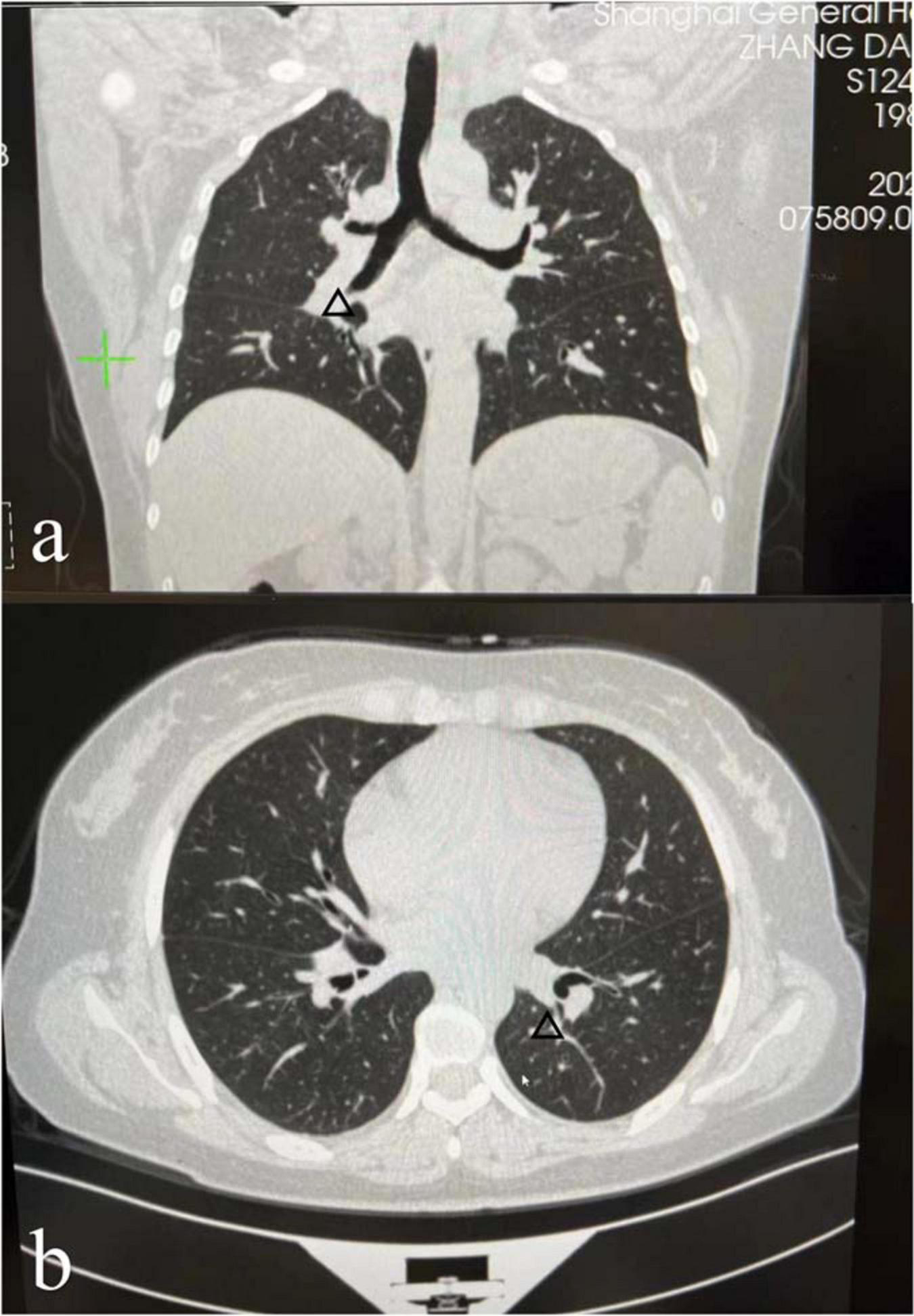 The results of laboratory tests such as serum angiotensin-converting enzyme (ACE) levels and T-spot were within normal limits (Table 1). Enhanced computed tomography (CT) of the chest with contrast demonstrated a few diffuse reticulonodular opacities in the bilateral lower lobe, bilateral hilar lymph nodes enlargement, and in the posterior segment of the right upper lobe are some small ground glass nodules (Figures 2a,b). The patient declined additional invasive diagnostic procedures, such as bronchoscopy/BAL or EBUS for lymphadenopathy.