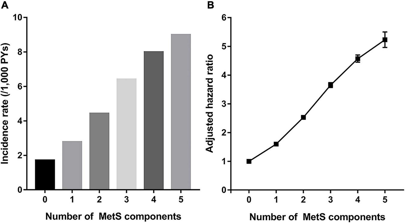 The mean follow-up duration was 7.4 ± 1.2 years. During the study period, 88,058 men were newly diagnosed with gout, and the incidence rate of gout was 3.36 per 1,000 PYs. The mean time to diagnosis of gout was 5.5 ± 2.2 years, and the mean age at gout diagnosis was 37.9 ± 5.0 years. MetS was associated with a more than doubled risk of gout [adjusted HR (aHR) 2.44, 95% CI 2.41–2.48; Table 2]. Among the components of MetS, abdominal obesity had the greatest association with gout (aHR 2.45, 95% CI 2.42–2.49), followed by elevated TG (aHR 2.29, 95% CI 2.26–2.32). The cumulative incidence of gout according to baseline MetS status is presented in Figure 2.