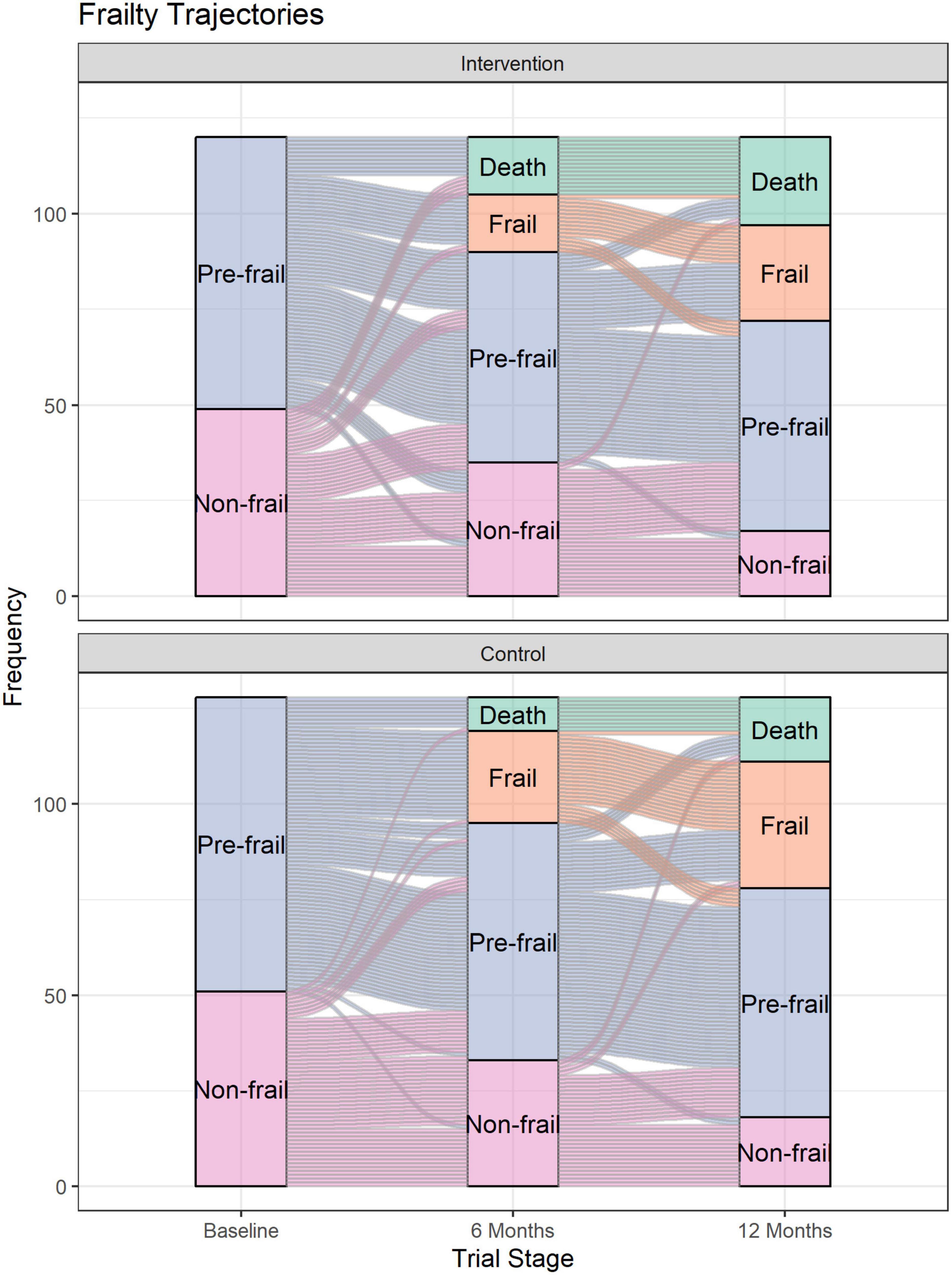Figure 1. Proportion of participants who were non-frail, pre-frail, frail, or died over the 12-month study period.