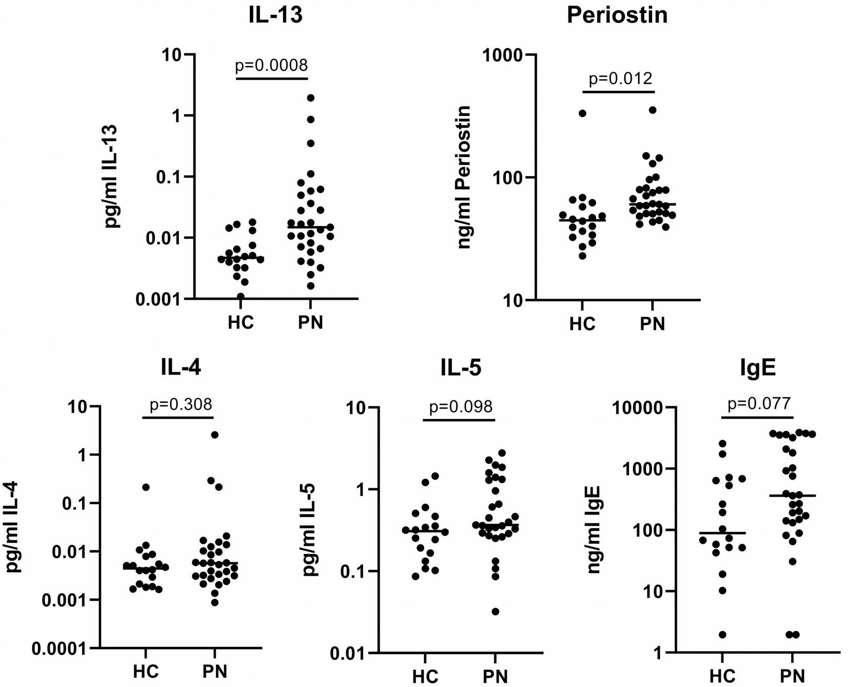 Single-plex assays of the type 2 inflammatory biomarkers demonstrated significantly elevated circulating plasma IL-13 (0.13 vs. 0.006 pg/mL, p = 0.0008) and periostin (80.3 vs. 60.2 ng/mL, p = 0.012) in PN patients compared to controls. IL-4 (0.11 vs. 0.02 pg/mL, p = 0.30) and IL-5 (0.75 vs. 0.40 pg/mL, p = 0.10) were not significantly elevated, while IgE approached significance in PN (1202.0 vs. 432.7 ng/mL, p = 0.08) (Figure 2).