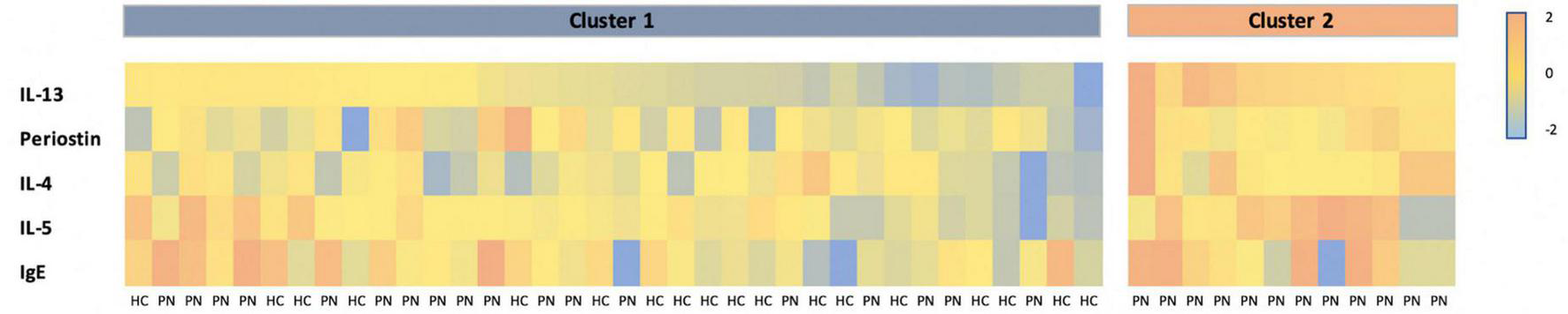Single-plex assays of the biomarkers demonstrated elevated circulating plasma IL-13 (0.13 vs. 0.006 pg/mL, p = 0.0008) and periostin (80.3 vs. 60.2 ng/mL, p = 0.012) in PN compared to controls. IL-4 (0.11 vs. 0.02 pg/mL, p = 0.30) and IL-5 (0.75 vs. 0.40 pg/mL, p = 0.10) were not significantly elevated, while IgE approached significance (1202.0 vs. 432.7 ng/mL, p = 0.08). Clustering of PN and control patients together revealed two clusters. Cluster 1 (n = 36) consisted of 18 PN patients and 18 controls. Cluster 2 (n = 11) consisted entirely of PN patients (p < 0.01). Cluster 2 had higher levels of IL-13 (0.33 vs. 0.008 pg/mL, p = 0.0001) and IL-5 (1.22 vs. 0.43 pg/mL, p = 0.03) compared to cluster 1.