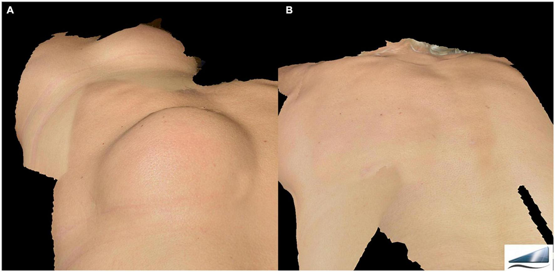 Image of giant lipoma placed on patient’s back acquired using the 3D Photography System LifeViz® Mini (QuantifiCare) before (A) and 6 months after laser treatment (B). A complete removal of the lipoma is observed without any aesthetic damage.