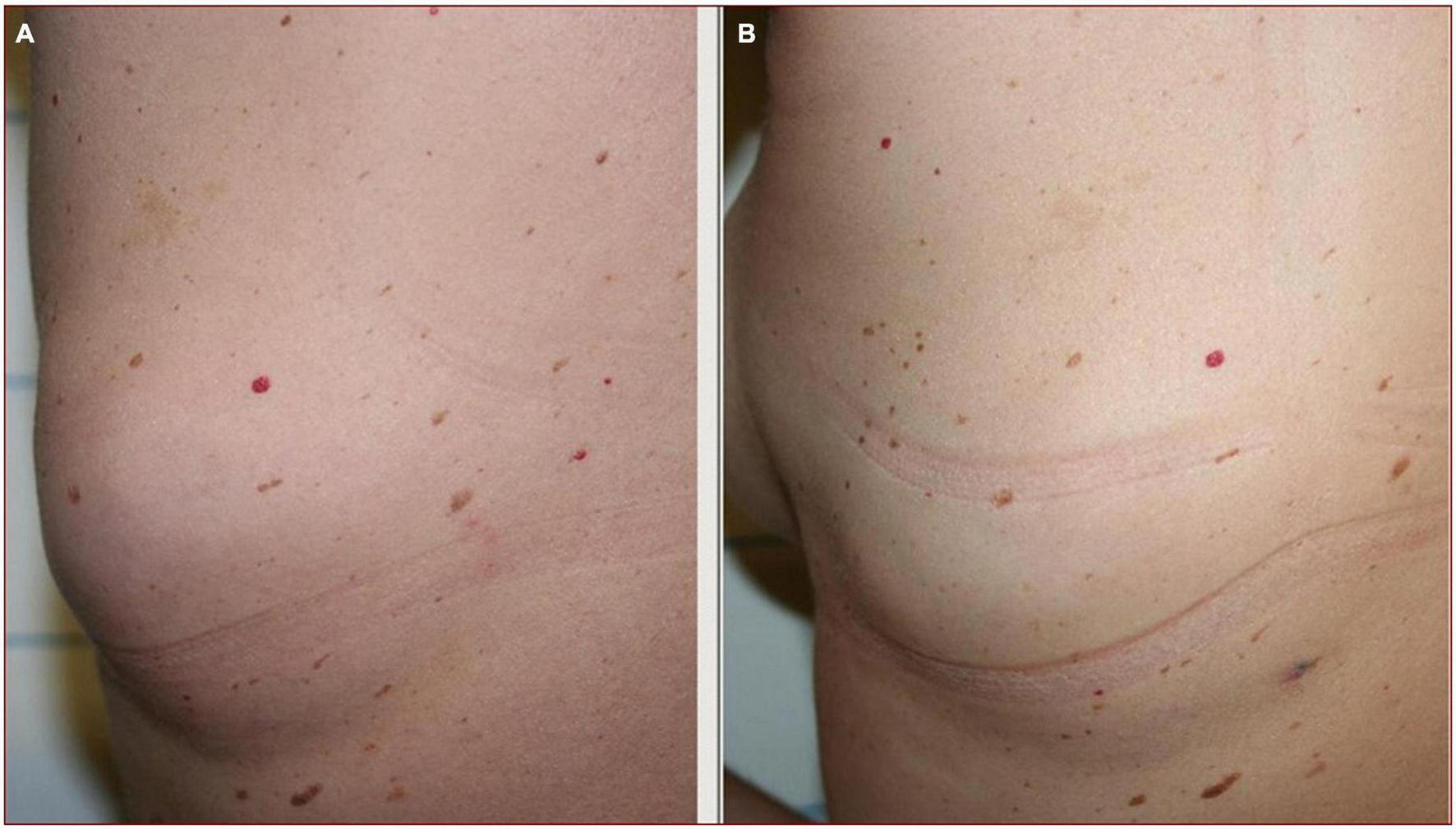 Lipoma on patient’s back (A). Photographic evaluation shows a complete lipoma removal after laser treatment (B).