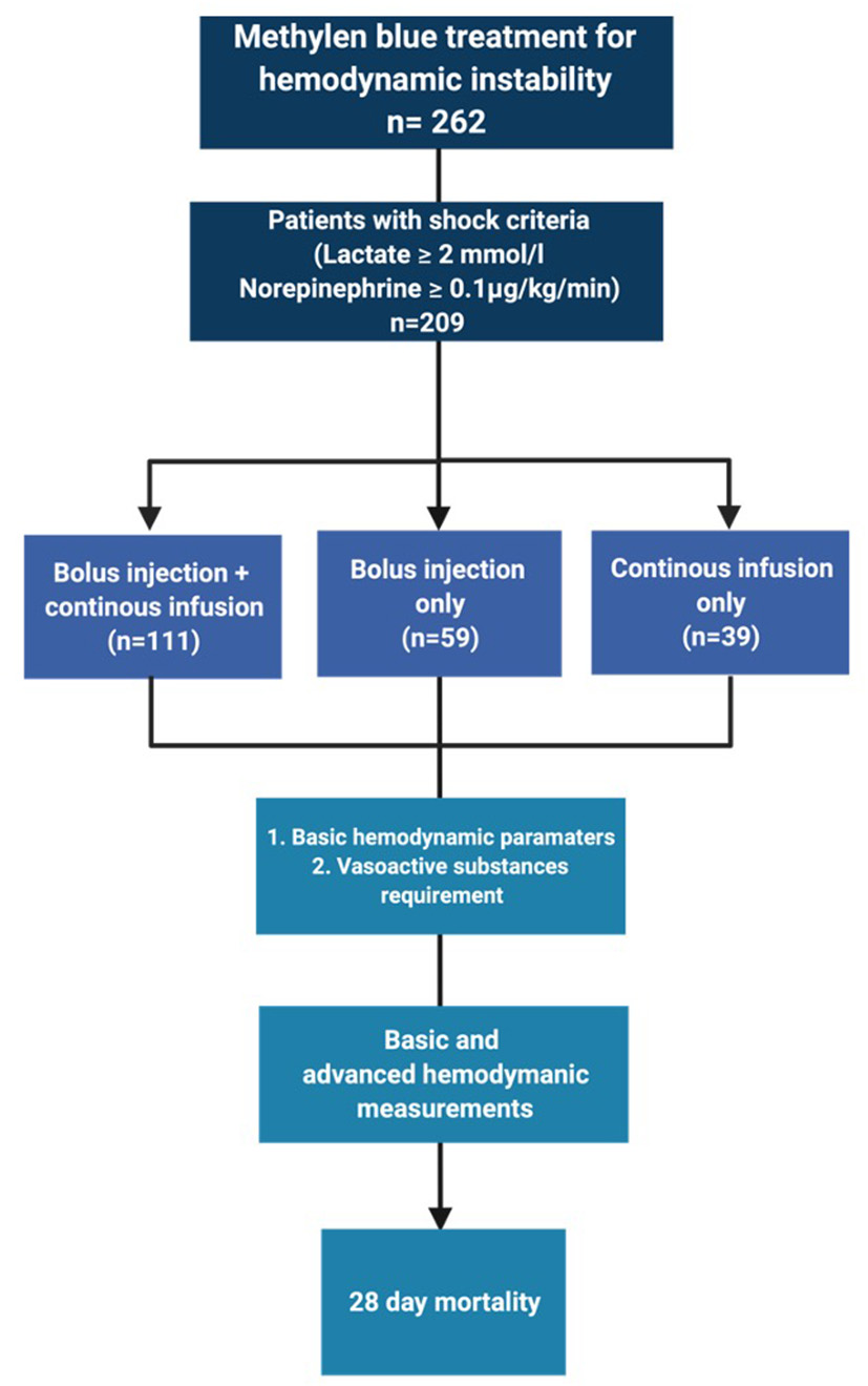 All patient records who were treated at the Department of Anesthesiology and Intensive Care Medicine between July 2014 and October 2019 were retrospectively screened for inclusion in this observational cohort study. We selected all patients who received methylene blue during their stay in the ICU. We included patients with the following inclusion criteria: Norepinephrine dose 0.1 μg/kg/min, serum lactate 2 mmol/l and methylene blue treatment. The following exclusion criteria were applied: Age < 18 years, no vasopressor or inotropic therapy, administration of methylene for other reasons than hemodynamic compromise.