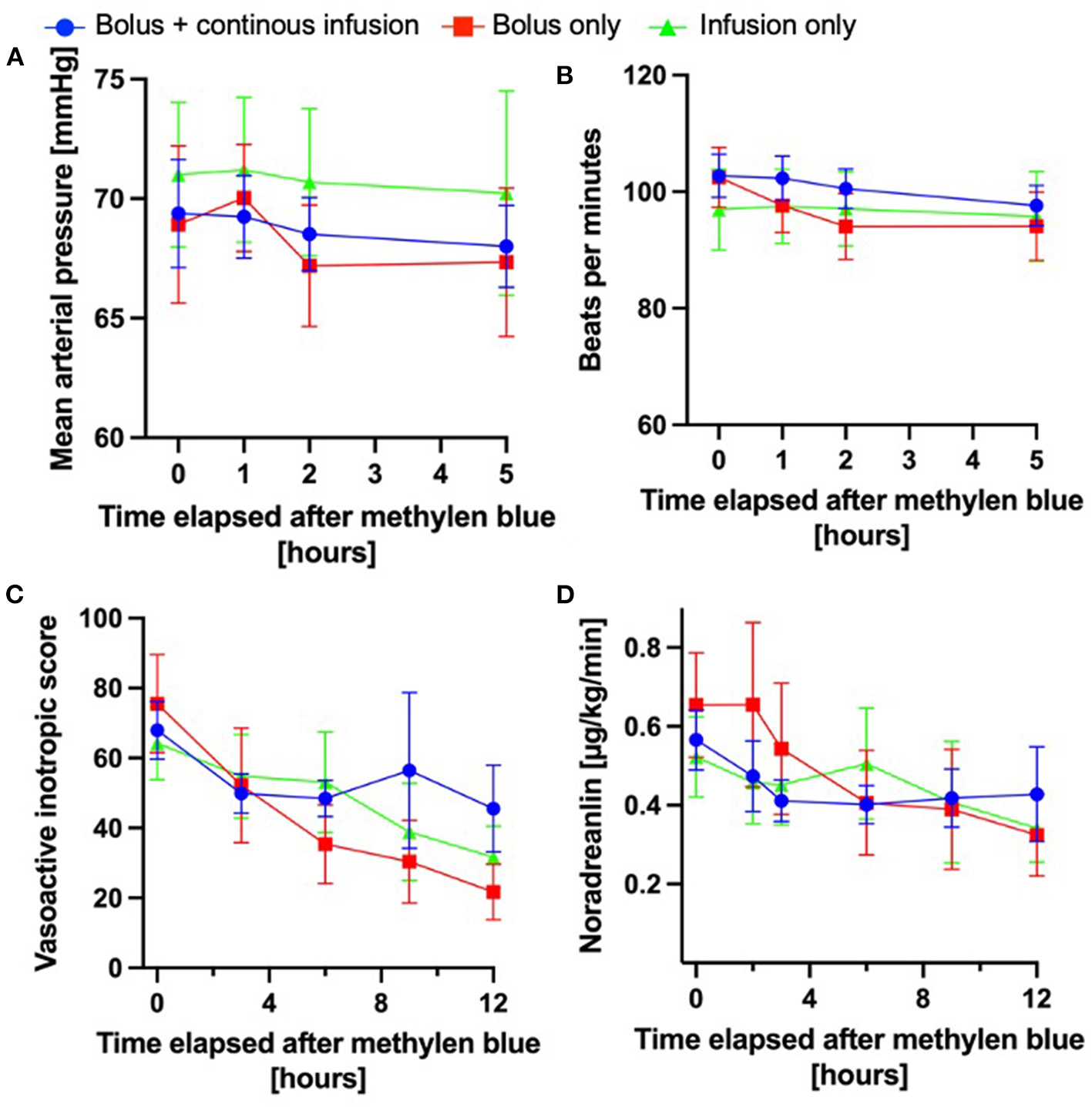 Hemodynamic changes after methylene blue administration. The injection time points of the methylene blue bolus were defined as “0 h”; all subsequent time indicators were defined in relation to the administration of methylene blue administration. (A) Mean arterial pressure over time in the different methylene blue treatment groups over time. (B) Heart rate over time after methylene blue administration (A + B: bolus + continuous infusion: n = 111–110; bolus only: n = 47–59; continuous infusion only n = 35–39). (C) Norepinephrine infusion rate in μg/kg/min over time after methylene blue administration. (D) Development of vasoactive inotropic score after methylene blue administration (C + D: bolus + continuous infusion: n = 111–110; bolus only: n = 47–59; continuous infusion only n = 35–39); All data are shown as mean ± 95% confidence interval.