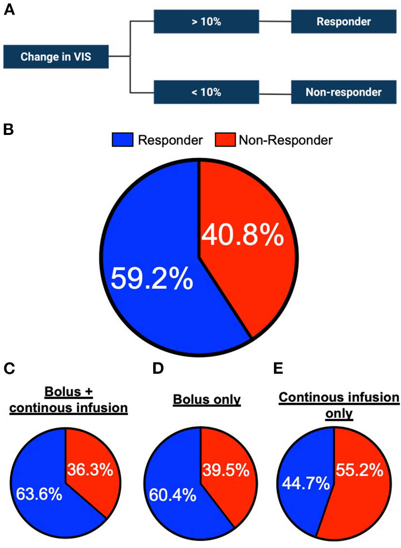 Percentage of methylene blue responders per administration group. (A) Schematic of the definition of responder or non-responder status to methylene blue treatment. (B) Proportion of responders and non-responders in the study cohort (n = 196 in total) (C) bolus + continuous infusion cohort (n = 110 in total) (D) bolus only infusion group (n = 48) or (E) continuous only cohort (n = 38).