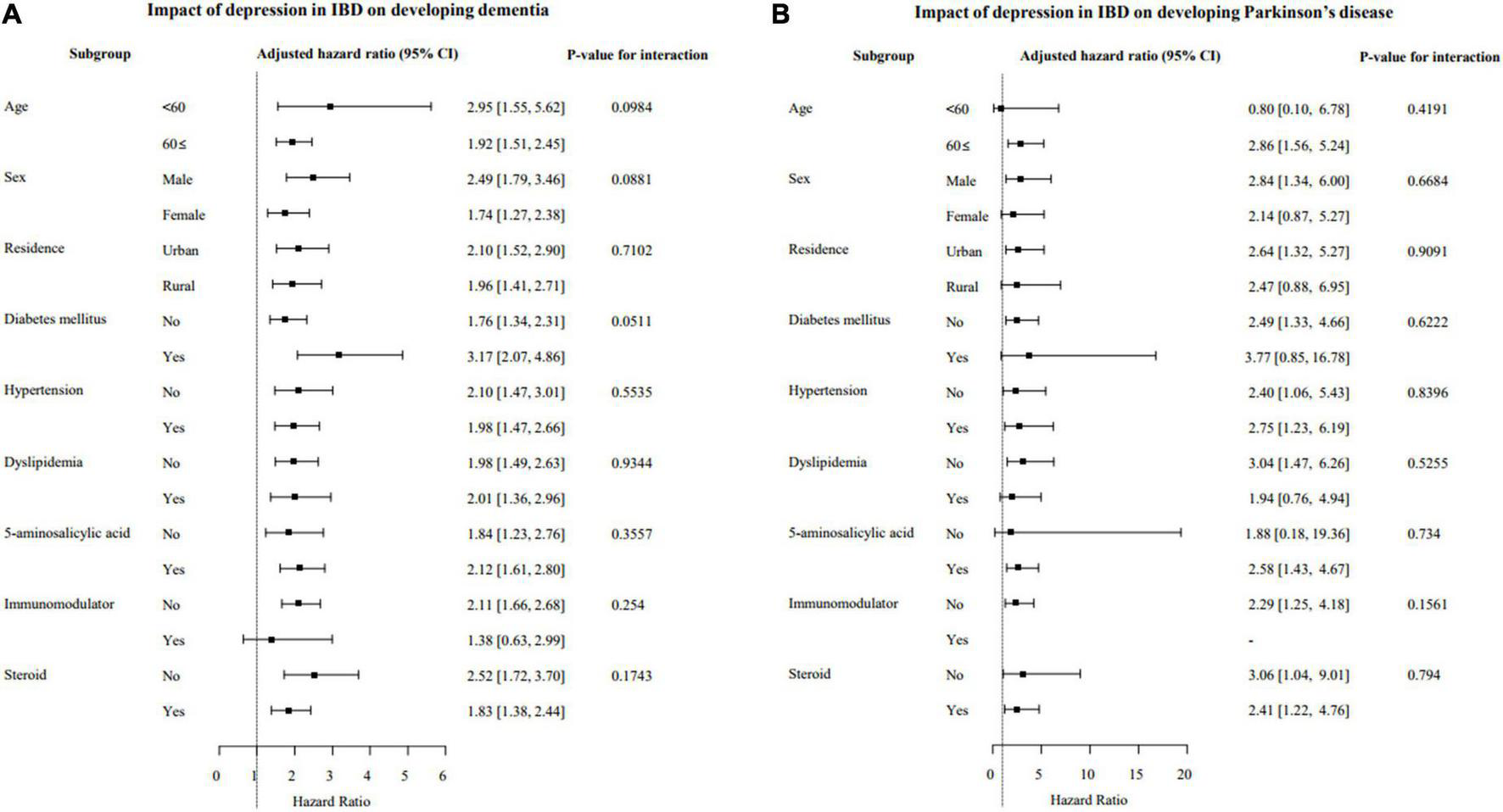 During a mean follow-up of 8 years, IBD patients with depression experienced dementia (6.7 vs. 2.0%; p < 0.001) and PD (1.1 vs. 0.3%; p < 0.001) significantly more than IBD patients without depression. Compared with IBD patients without depression, the risk of developing dementia was significantly higher in IBD patients with depression [adjusted hazard ratio (aHR) for IBD, Crohn’s disease (CD), and ulcerative colitis (UC), 2.03, p < 0.001; 1.68, p = 0.033; 2.13, p < 0.001, respectively]. Compared with IBD patients without depression, the risk of developing PD was significantly higher in IBD patients with depression (aHR for IBD, CD, and UC, 2.54, p < 0.001; 1.93, p = 0.470; 2.75, p < 0.001, respectively). The cumulative incidence of dementia and PD in IBD patients with depression was significantly higher than in IBD patients without depression and showed a steady increase after a diagnosis of depression.