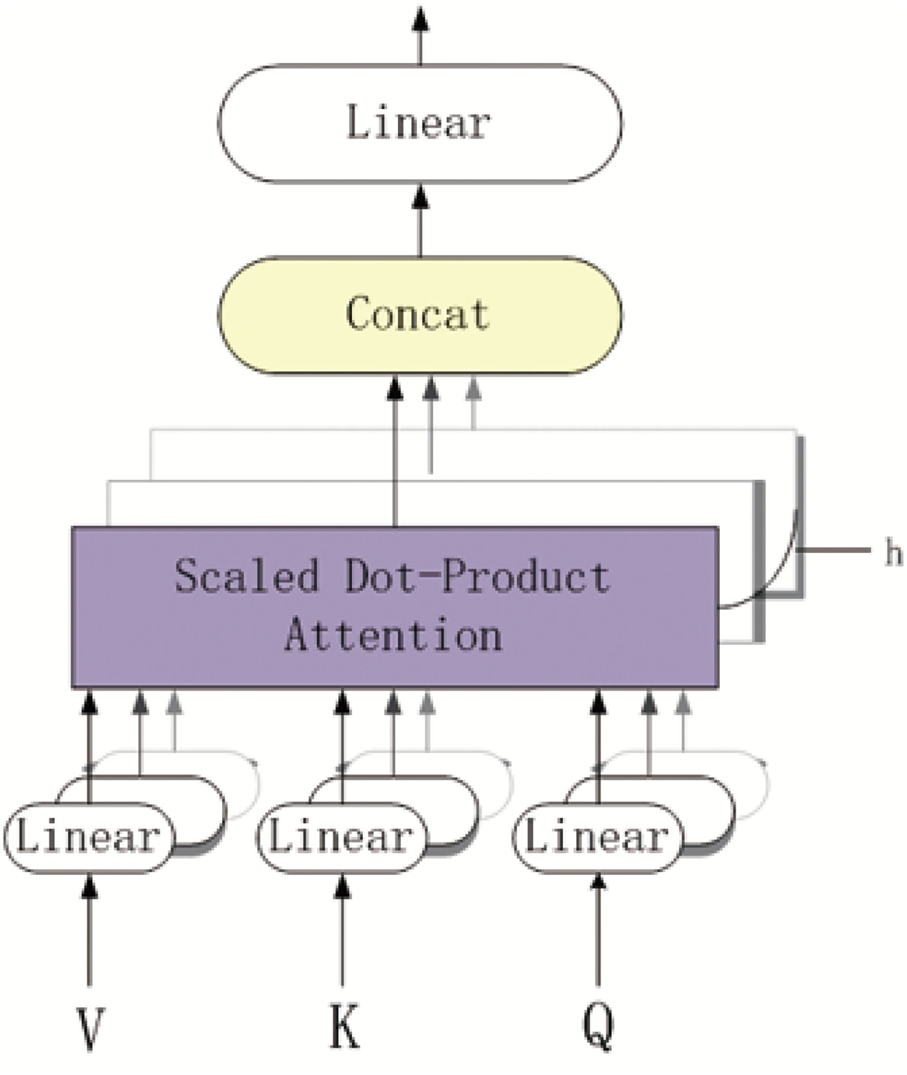 In addition, the multi-head attention mechanism can jointly attend to information from different representation subspaces at different positions. For the output multi-head attention mechanism, the computation process is defined as follows: