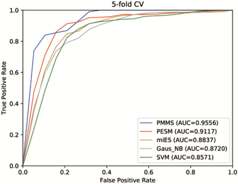 Figure 4 shows the receiver operating characteristics (ROC) curve and AUCs of PMMS and other compared methods. If AUC = 1, it would indicate that all test samples were perfectly predicted, while AUC = 0.5 would mean the model only had random prediction performance. We can observe from Figure 4 that PMMS obtained an AUC of 0.9556 in 5 CV. However, the AUCs of PESM, miES, Gaus_NB, and SVM are 0.9117, 0.8837, 0.8720, and 0.8571, respectively. It illustrates that our method can obtain better prediction performance than other compared methods.