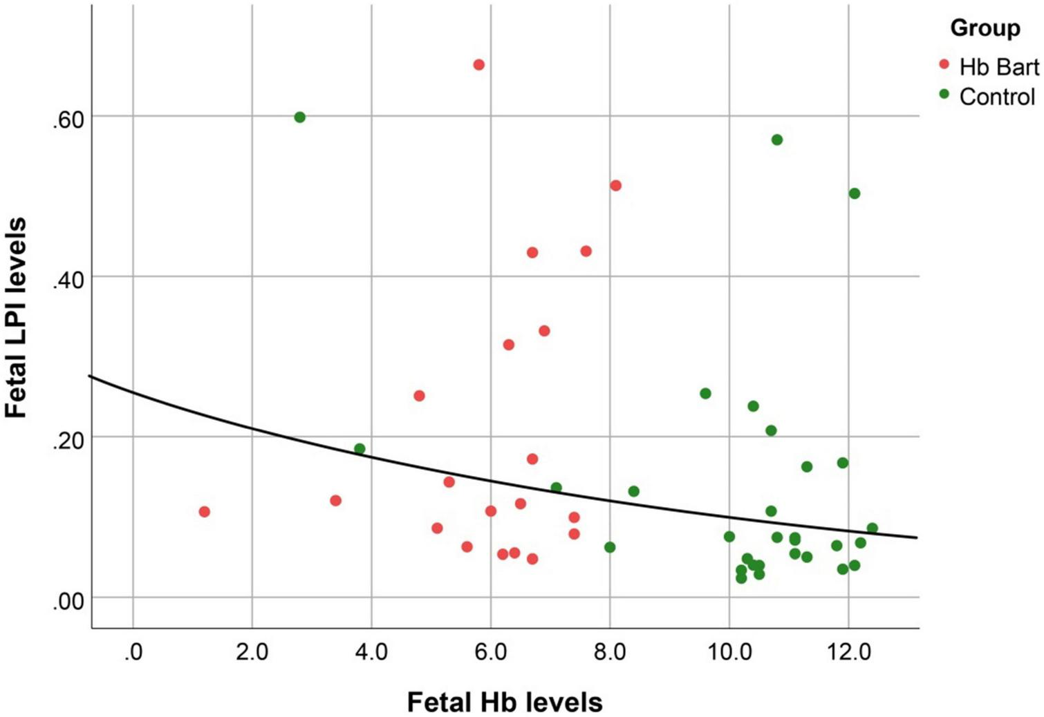 The correlation between fetal LPI (Labile Plasma Iron) levels and fetal hemoglobin levels (Exponential function; R2: 0.095; p: 0.030).
