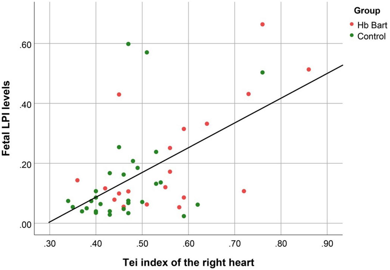 A total of 50 fetuses, including 20 fetuses with Hb Bart’s disease and 30 unaffected fetuses were recruited. There was a significant increase in the level of serum iron in the affected group (median: 22.7 vs. 9.7; p-value: 0.013) and also a significant increase in NTBI when compared with those of the unaffected fetuses (median 0.11 vs. 0.07; p-value: 0.046). In comparisons of fetal cardiac function, myocardial performance (Tei) index of both sides was significantly increased in the affected group (left Tei: p = 0.001, Right Tei: p = 0.008). Also, isovolumetric contraction time (ICT) was also significantly prolonged (left ICT: p = 0.00, right ICT: p = 0.000). Fetal LPI levels were significantly correlated inversely with fetal hemoglobin levels (p = 0.030) but not significantly correlated with the fetal serum iron levels (p = 0.138). Fetal LPI levels were also significantly correlated positively with myocardial performance index (Tei) of both sides (right Tei: R = 0.000, left Tei: R = 0.000) and right ICT (R = 0.013), but not significantly correlated with left ICT (R = 0.554).