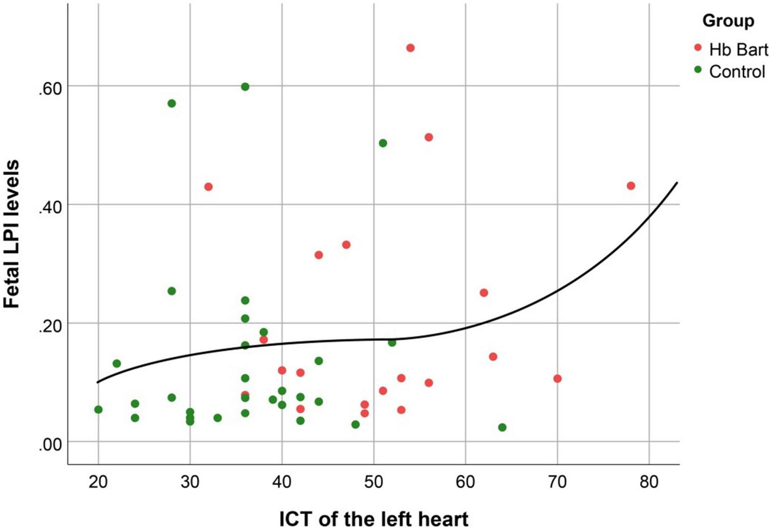 The correlation between fetal LPI (Labile Plasma Iron) levels and fetal left isovolumetric contraction times (ICT) (Cubic function; R2: 0.044; p: 0.554).