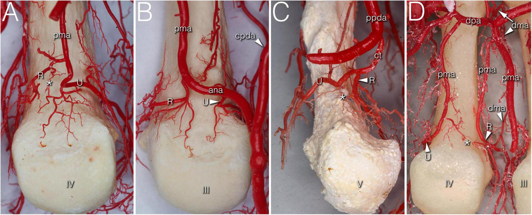 Variations of R- and U- branches on corrosion cast specimens (palmar view). (A) Dominant U-branch as a continuation of the palmar metacarpal artery. Note the two palmar enosseal vessels originating as a common trunk from the U-branch. (B) The U-branch originates from the anastomosis between the palmar metacarpal artery and the common palmar digital artery. (C) The R- and U-branches originate as a common trunk from the 10th proper palmar digital artery. (D) The R-branch originates from the early dividing neighboring palmar metacarpal artery. The U-branch is the continuation of a separately originating palmar metacarpal artery. Note the dorsal metacarpal artery anastomosing with the R-branch. ana, anastomosis between the palmar metacarpal artery and the common palmar digital artery; *, anastomosis between R and U branch; cpda, common palmar digital artery; ct, common trunk; dma, dorsal metacarpal artery; dpa, deep palmar arch; pma, palmar metacarpal artery; ppda, proper palmar digital artery; R, R-branch; U, U-branch; III, IV, V: 3rd, 4th, and 5th metacarpal heads.