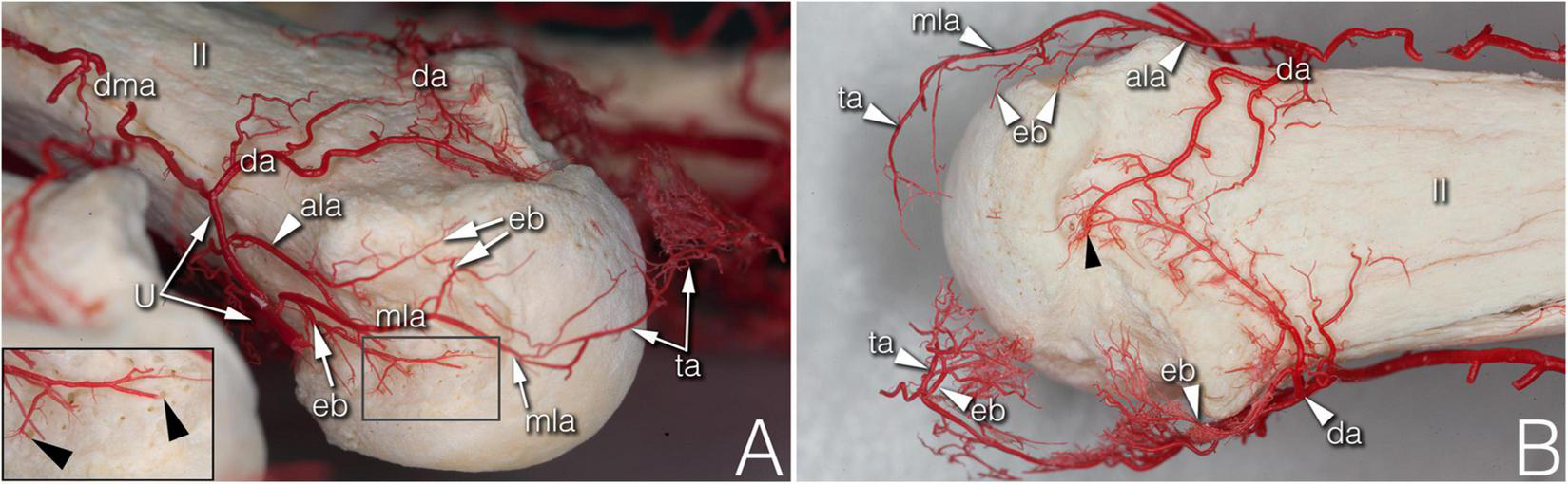 Supplying branches to the metacarpal territory on corrosion cast specimens. (A) (right hand anterolateral view) A strong enthesial branch arises directly from the first part of the main lateral artery and gives off branches running toward the nutrient foramina of the lateral depression (see insert). Both the upper accessory lateral artery and the main lateral artery give off one further enthesial branch to the upper part of the lateral depression. The main lateral artery curves to and terminates at the projection of the triangular arcade. (B) (upper view of the same specimen) Note the spiky character of the ulnar sided enthesial branches (top of image), while radially (bottom of image) both the enthesial branch and the triangular arcade artery demonstrate a bushy appearance. ala, accessory lateral artery; da, dorsal arcade; dma, dorsal metacarpal artery; eb, enthesial branch; mla, main lateral artery; ta, triangular arcade; U, U-branch; black arrowheads, entry point of enosseal arteries; II, 2nd metacarpal head.