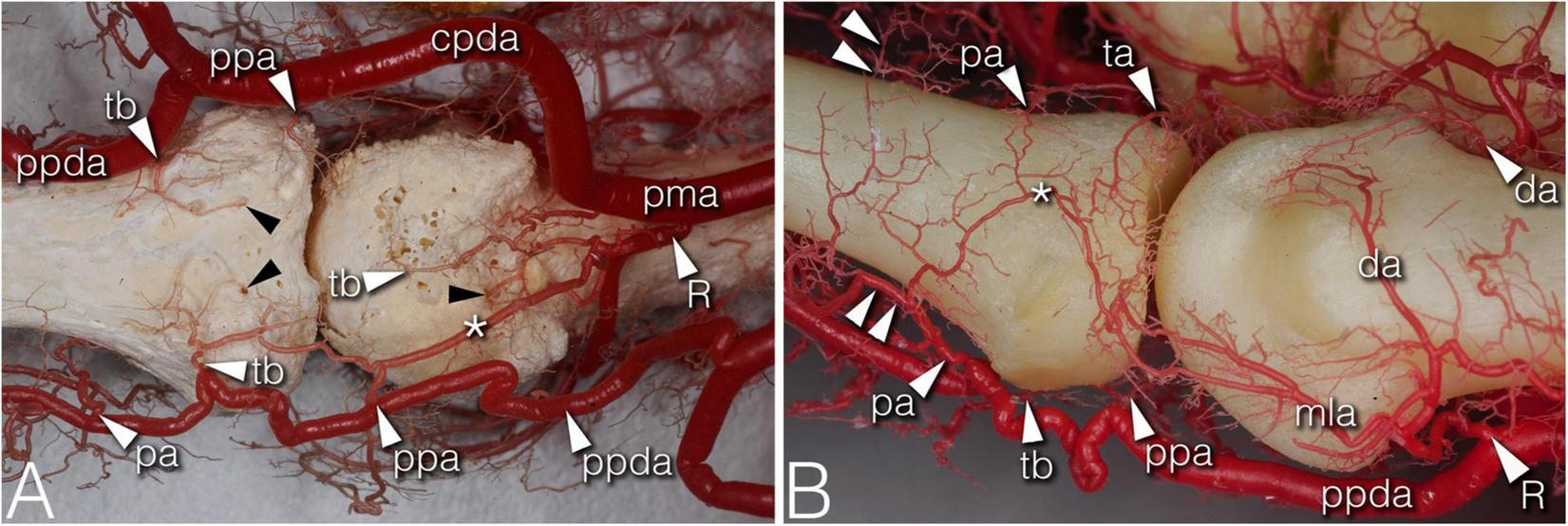 Arteries of the phalangeal territory on corrosion cast specimens. (A) (4th finger, palmar view) Note the long anastomosis between the R-branch and the palmar plate artery. Proximal from the anastomosis a short trunk arises acting as a tenosynovial vessel, with one branch reaching to the metacarpal head and another branch extending to the projection of the flexor tendon. (B) (2nd finger, dorsolateral view) The phalangeal arcade originates as one common trunk, with one branch supplying the arcade on the dorsal surface of the phalanx, and another branch forming a more superficial arcade according to the projection of the extensor hood. The triangular and phalangeal arcade are in connection through a short anastomosis. Note the small branches from the triangular arcade showing a pectinate character in the axial plane. *, anastomosis; cpda, common palmar digital artery; da, dorsal arcade; mla, main lateral artery; pa, phalangeal arcade; pma, palmar metacarpal artery; ppa, palmar plate artery; ppda, proper palmar digital artery; R, R-branch; ta, triangular arcade; tb, tenosynovial branch; black arrowheads, entry point of enosseal arteries; doubled arrowheads, supplying arch for the extensor tendon.