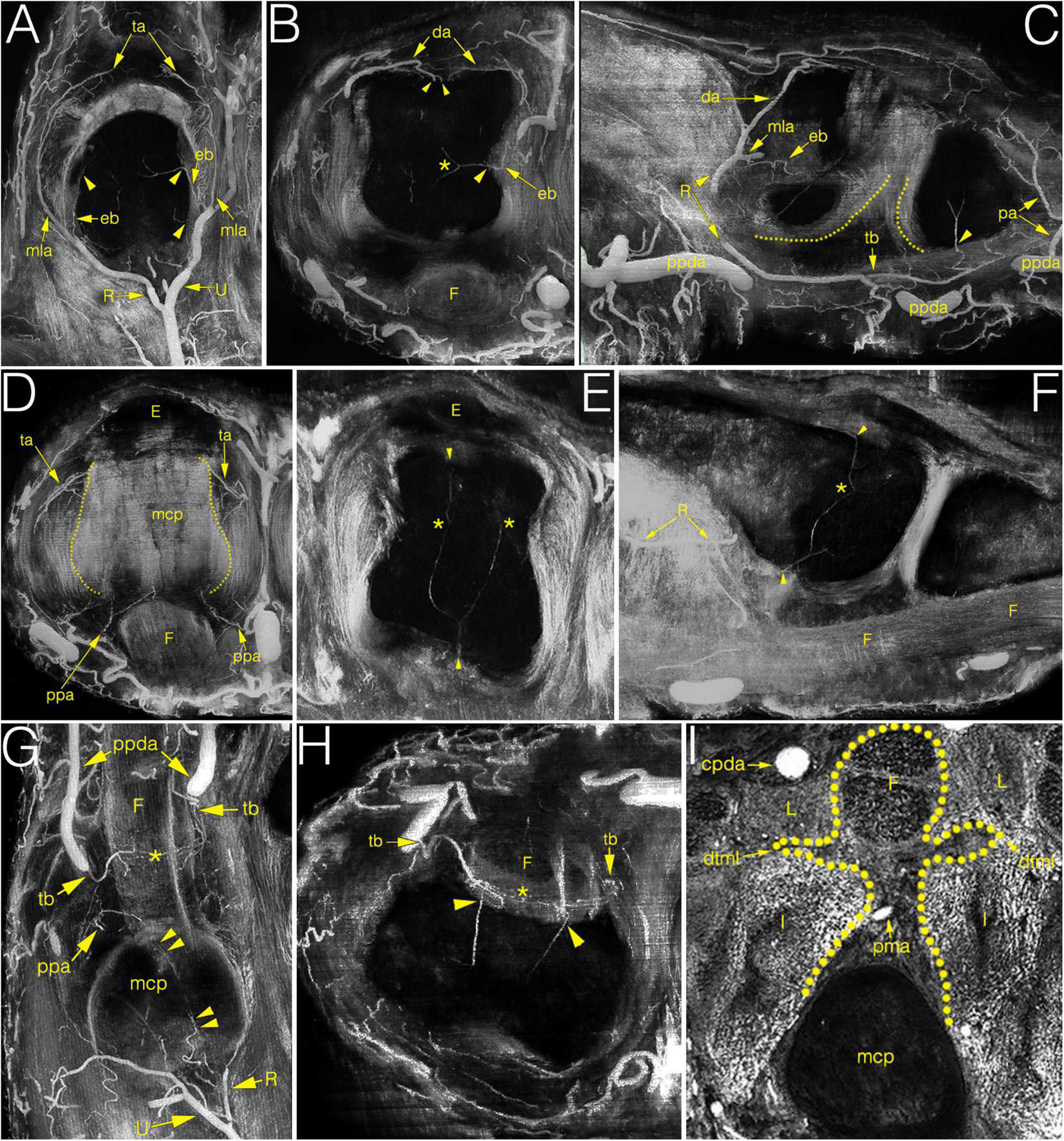 Multiplanar (MIP) image reconstructions on cryosectioned specimens demonstrating the relationship between arteries and joint structures. (A–C) main supplying branches on coronal, axial and sagittal plane, respectively. Note on C the elongated anastomosis between the R-branch and the tenosynovial branch. Dotted lines indicate the palmar articular surfaces of bones; (D) palmar plate artery and the triangular arcade on the axial plane. Dotted lines indicate the lateral borders of metacarpal head; (E,F) blood supply of the metacarpal head on the axial and sagittal plane. Note the anastomosis between the dorsal, palmar and lateral enosseal arteries, respectively. Compare with panel (B). (G,H) origin and course of the tenosynovial trunk on the coronal and axial plane. Note the anastomosis between the two sides within the flexor tendon. (I) homuncule shaped (dotted line) soft tissue complex in the center with the palmar metacarpal artery on the axial plane. *, anastomosis; cpda, common palmar digital artery; da, dorsal arcade; dtml, deep transverse metacarpal ligament; eb, enthesial branch; E, extensor tendon; F, flexor tendon; I, interosseous muscle; L, lumbrical muscle; mcp, metacarpal; mla, main lateral artery; pa, phalangeal arcade; pma, palmar metacarpal artery; ppa, palmar plate artery; ppda, proper palmar digital artery; R, R-branch; ta, triangular arcade; tb, tenosynovial trunk; U, U-branch; arrowheads, entry point of enosseal arteries; doubled arrowheads, supplying artery from the R-branch to the flexor tendons.