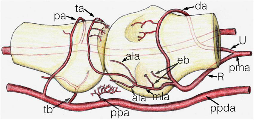 Schematic drawing of the main arterial vessels of the metacarpophalangeal joint. The proximal (metacarpal) half and distal (phalangeal) half are shown on the right and left side of the image respectively. ala, accessory lateral artery; da, dorsal arcade; eb, enthesial branch; mla, main lateral artery; pa, phalangeal arcade; pma, palmar metacarpal artery; ppa, palmar plate artery; ppda, proper palmar digital artery; R, R-branch; ta, triangular arcade; tb, tenosynovial branch; U, U-branch.