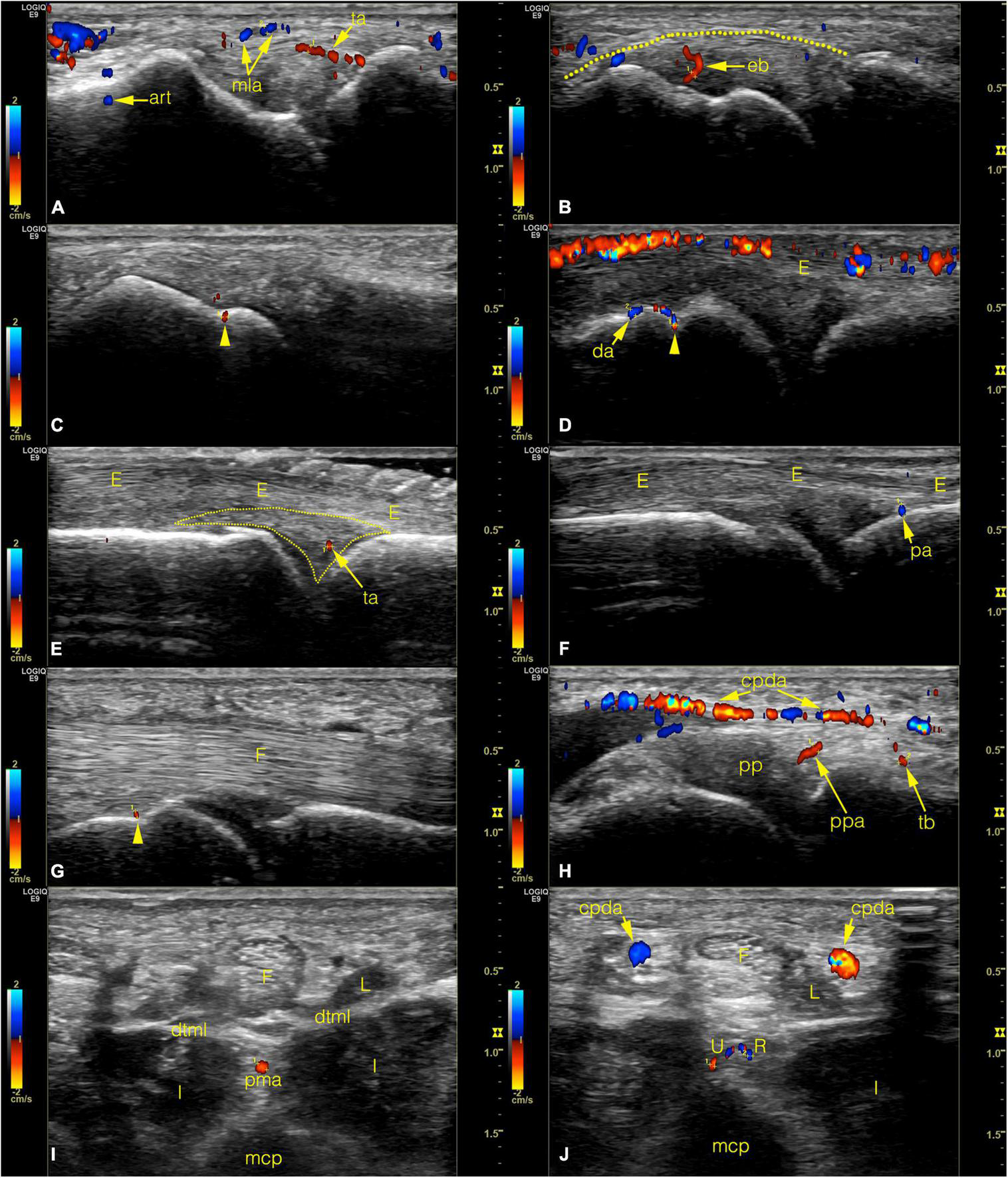 Operator dependency has been an obstacle to rheumatological ultrasonography. For proficiency in ultrasonography not only proper image acquisition but correct interpretation is paramount. Besides a deep understanding of ultrasound physics and equipment operation techniques, a high level of anatomical and pathological knowledge is crucial to perform musculoskeletal ultrasonography appropriately. While large vessel anatomy of the hand is routinely taught at medical courses, small vessel anatomy is usually only included in teaching material for hand surgical specialties (21).